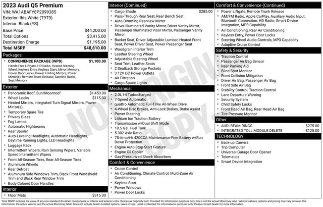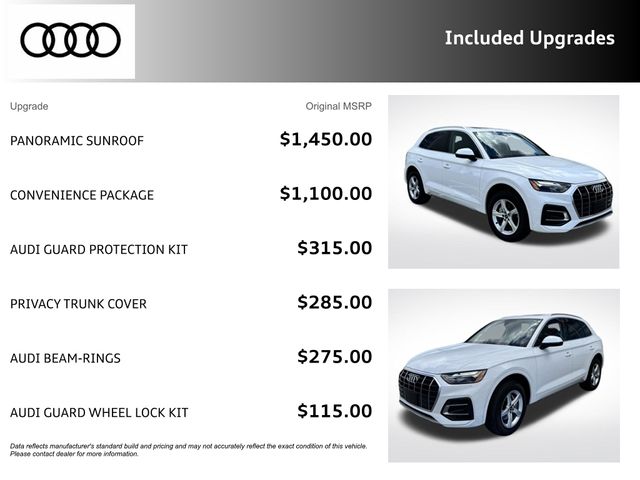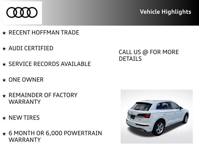 Certified. Ibis White 2023 Audi Q5 40 Premium quattro quattro 7-Speed Automatic S tronic 2.0L Turbocharged RECENT HOFFMAN TRADE, AUDI CERTIFIED, SERVICE RECORDS AVAILABLE, ONE OWNER, REMAINDER OF FACTORY WARRANTY, NEW TIRES, 6 MONTH OR 6,000 POWERTRAIN WARRANTY, Audi Advanced Key, Audi Beam-Rings, Auto-Dimming Power Folding Exterior Mirrors, Convenience Package, Driver Seat & Mirror Memory, Heated Steering Wheel, Panoramic Sunroof, SiriusXM w/360L.