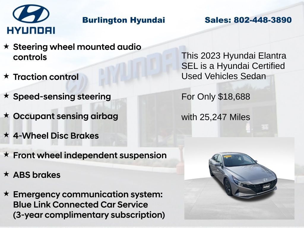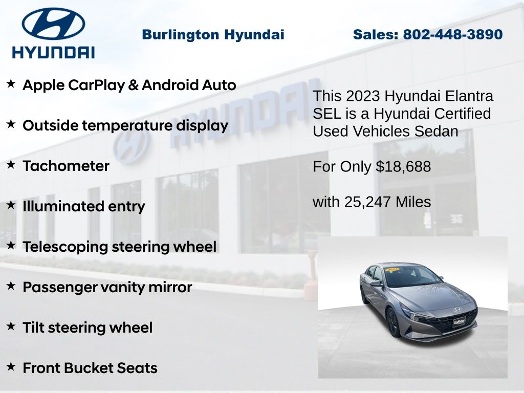 Discover the perfect balance of style, efficiency, and technology in this 2023 Hyundai Elantra SEL. With its sleek exterior, spacious interior, and impressive array of features, this sedan is poised to exceed your expectations and elevate your driving experience.