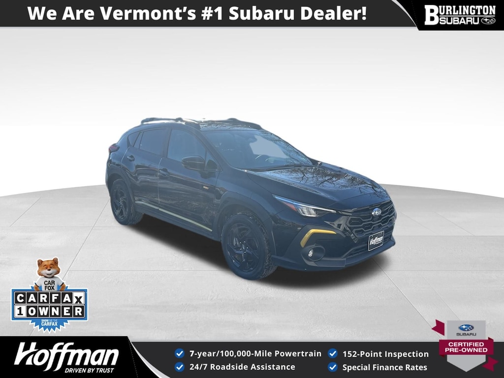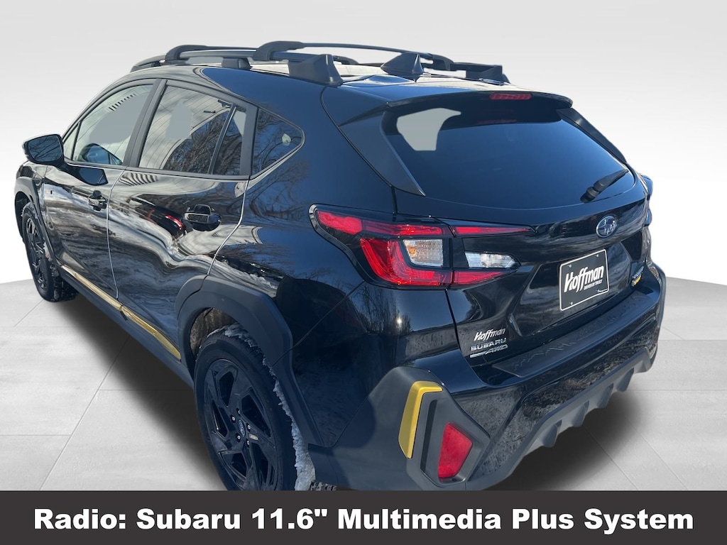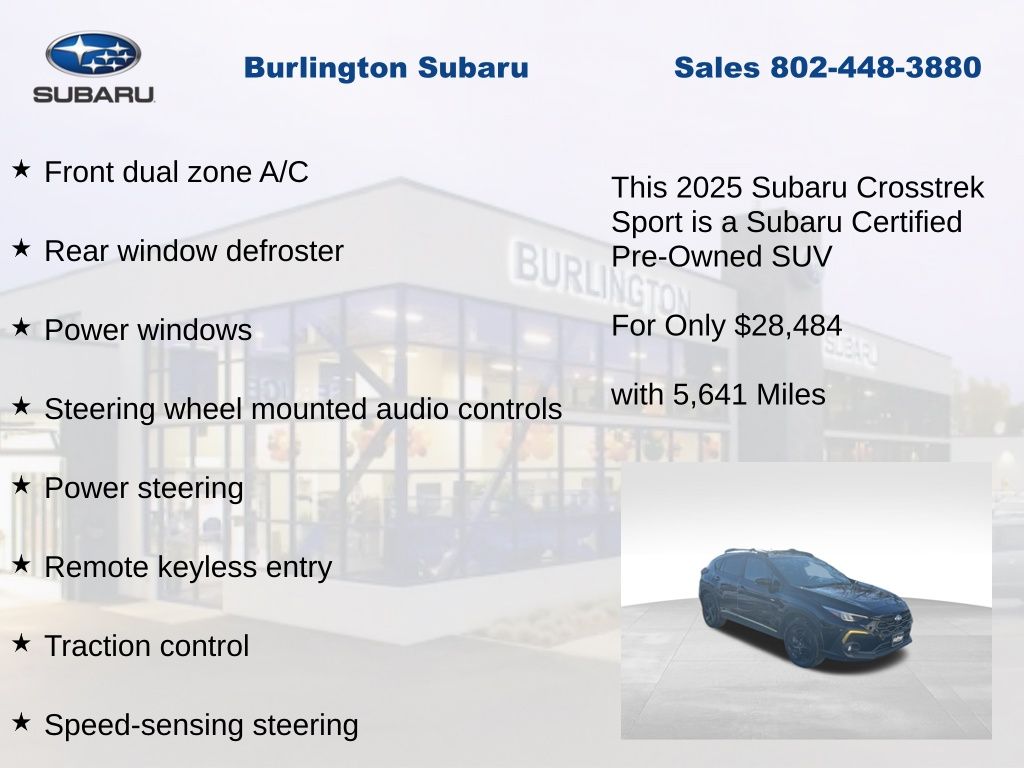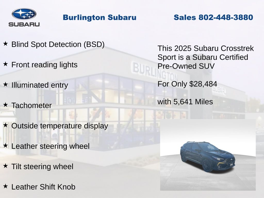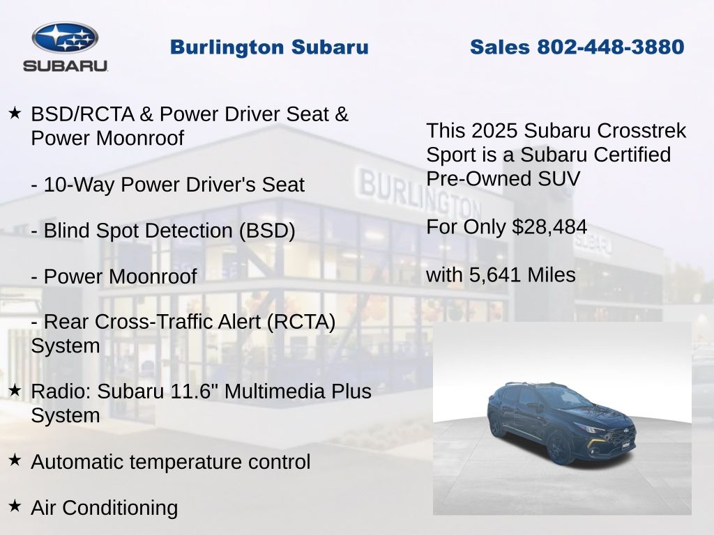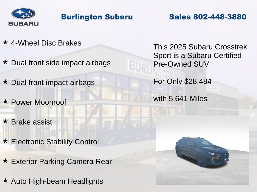 CARFAX One-Owner. Clean CARFAX. Subaru Crosstrek Sport 2025 Certified. 10-Way Power Driver's Seat, 4-Wheel Disc Brakes, ABS brakes, Air Conditioning, Alloy wheels, Anti-whiplash front head restraints, Auto High-beam Headlights, Automatic temperature control, Blind Spot Detection (BSD), Brake assist, BSD/RCTA & Power Driver Seat & Power Moonroof, Driver vanity mirror, Dual front impact airbags, Dual front side impact airbags, Electronic Stability Control, Emergency communication system, Exterior Parking Camera Rear, Four wheel independent suspension, Front dual zone A/C, Front fog lights, Front reading lights, Fully automatic headlights, Heated door mirrors, Heated Front Bucket Seats, Illuminated entry, Knee airbag, Leather Shift Knob, Leather steering wheel, Low tire pressure warning, Occupant sensing airbag, Outside temperature display, Overhead airbag, Panic alarm, Passenger vanity mirror, Power door mirrors, Power Moonroof, Power steering, Power windows, Radio: Subaru 11.6" Multimedia Plus System, Rear Cross-Traffic Alert (RCTA) System, Rear window defroster, Rear window wiper, Remote keyless entry, Speed control, Speed-sensing steering, Split folding rear seat, Steering wheel mounted audio controls, Tachometer, Telescoping steering wheel, Tilt steering wheel, Traction control, Trip computer, Turn signal indicator mirrors, Variably intermittent wipers.