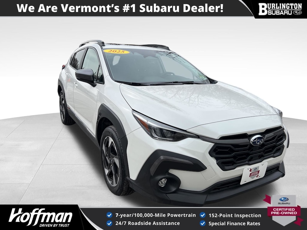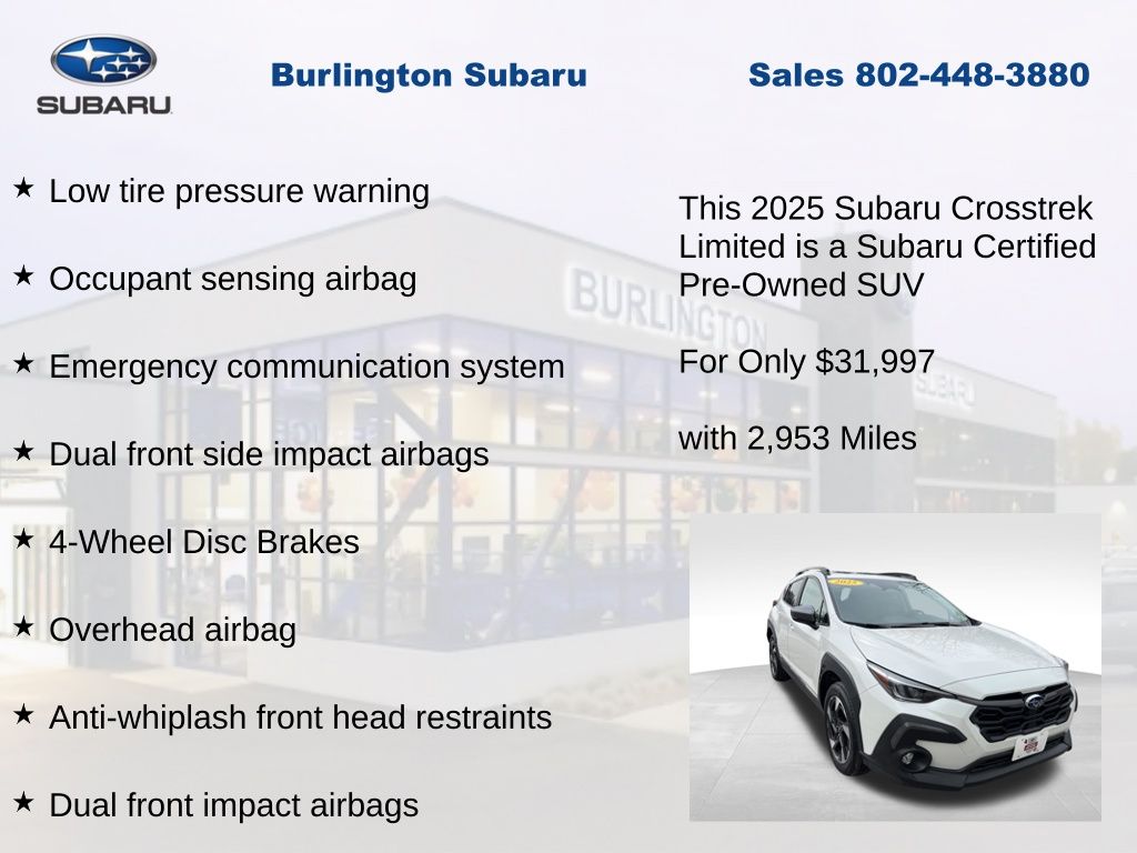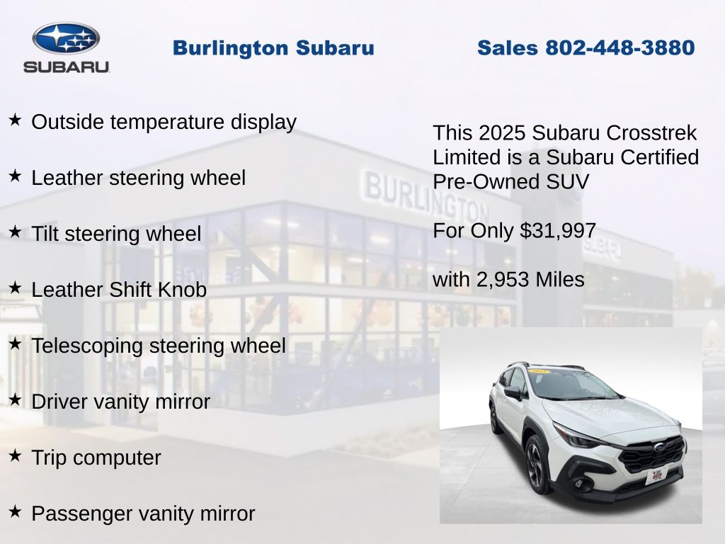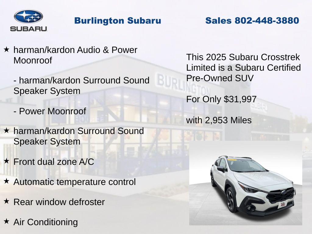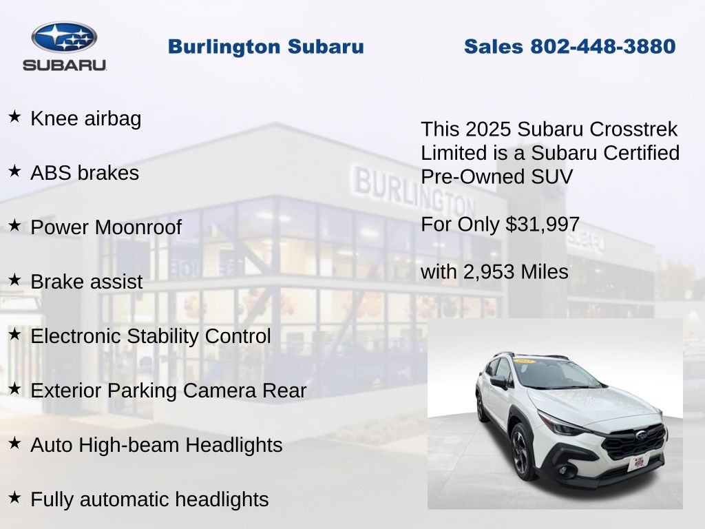 Clean CARFAX. Subaru Crosstrek Limited 2025 Certified. 4-Wheel Disc Brakes, ABS brakes, Air Conditioning, Alloy wheels, Anti-whiplash front head restraints, Auto High-beam Headlights, Automatic temperature control, Brake assist, Driver vanity mirror, Dual front impact airbags, Dual front side impact airbags, Electronic Stability Control, Emergency communication system, Exterior Parking Camera Rear, Four wheel independent suspension, Front dual zone A/C, Front fog lights, Front reading lights, Fully automatic headlights, harman/kardon Audio & Power Moonroof, harman/kardon Surround Sound Speaker System, Heated Front Bucket Seats, Illuminated entry, Knee airbag, Leather Shift Knob, Leather steering wheel, Leather-Trimmed Upholstery, Low tire pressure warning, Occupant sensing airbag, Outside temperature display, Overhead airbag, Panic alarm, Passenger vanity mirror, Power door mirrors, Power driver seat, Power Moonroof, Power steering, Power windows, Rear window defroster, Rear window wiper, Remote keyless entry, Speed control, Speed-sensing steering, Split folding rear seat, Steering wheel mounted audio controls, Tachometer, Telescoping steering wheel, Tilt steering wheel, Traction control, Trip computer, Turn signal indicator mirrors, Variably intermittent wipers. Odometer is 3033 miles below market average!