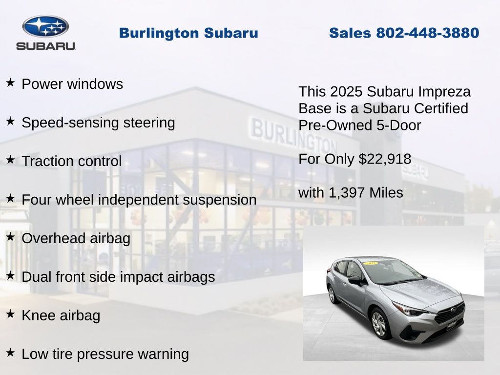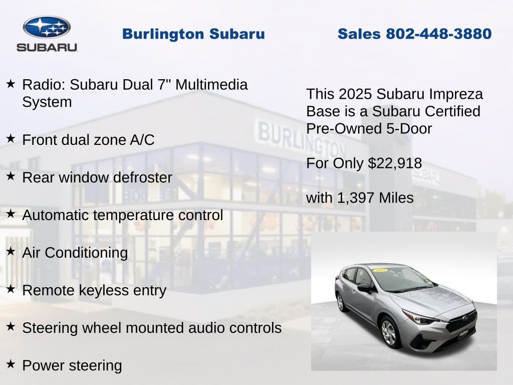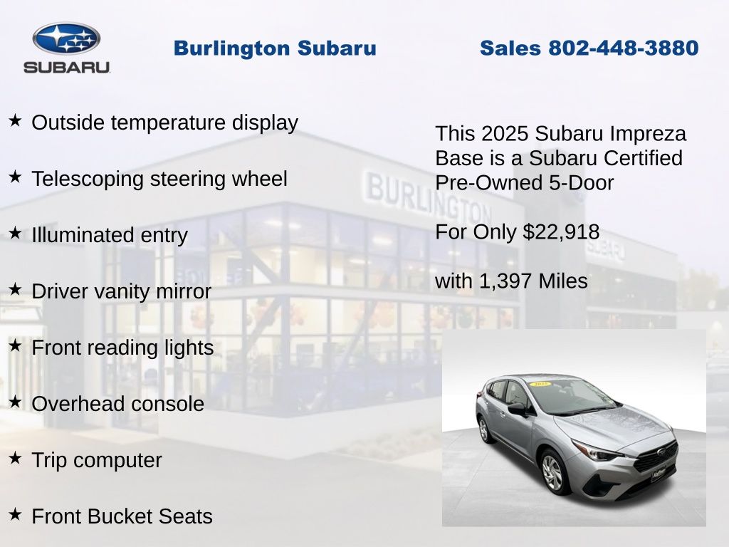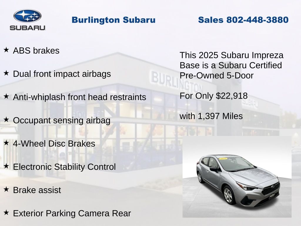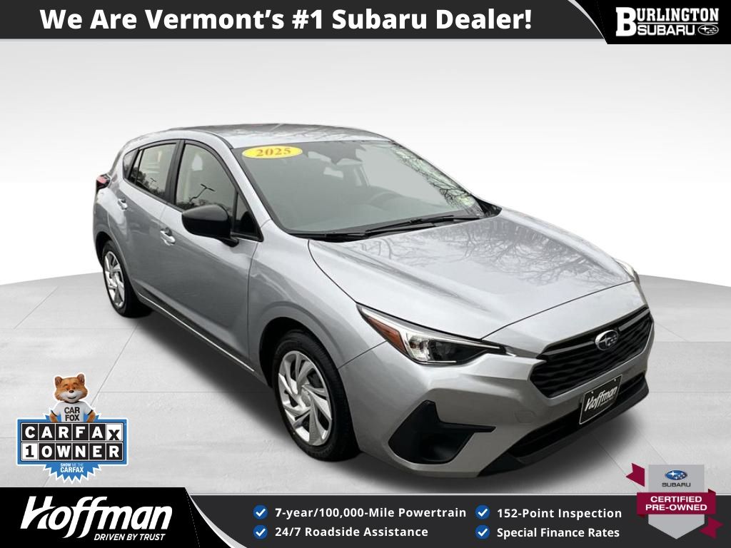CARFAX One-Owner. Clean CARFAX. Subaru Impreza 2025 Certified. 4-Wheel Disc Brakes, ABS brakes, Air Conditioning, Anti-whiplash front head restraints, Auto High-beam Headlights, Automatic temperature control, Brake assist, Driver vanity mirror, Dual front impact airbags, Dual front side impact airbags, Electronic Stability Control, Exterior Parking Camera Rear, Four wheel independent suspension, Front Bucket Seats, Front dual zone A/C, Front reading lights, Fully automatic headlights, Illuminated entry, Knee airbag, Low tire pressure warning, Occupant sensing airbag, Outside temperature display, Overhead airbag, Overhead console, Panic alarm, Passenger vanity mirror, Power door mirrors, Power steering, Power windows, Radio: Subaru Dual 7" Multimedia System, Rear window defroster, Rear window wiper, Remote keyless entry, Speed control, Speed-sensing steering, Split folding rear seat, Steering wheel mounted audio controls, Tachometer, Telescoping steering wheel, Tilt steering wheel, Traction control, Trip computer, Variably intermittent wipers. Odometer is 1204 miles below market average!