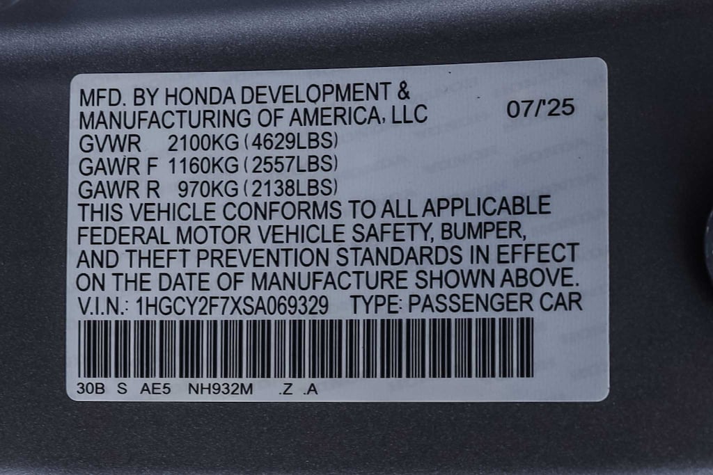 - 1HGCY2F7XSA069329