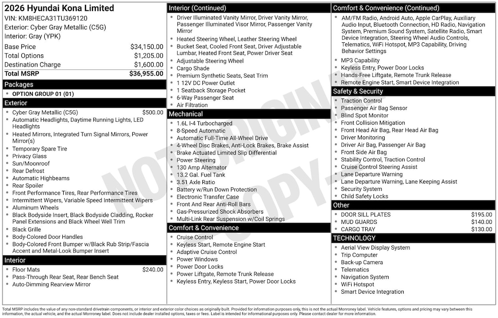 Cyber Gray Metallic 2026 Hyundai Kona Limited 4D Sport Utility AWD 8-Speed Automatic I4 25/28 City/Highway MPG