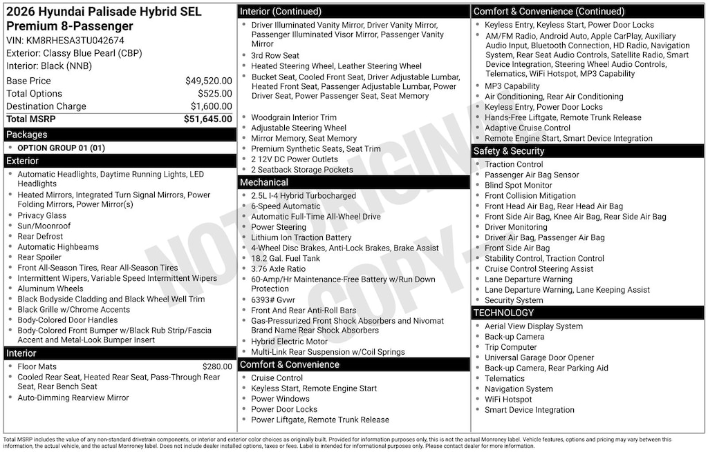 2026 Hyundai Palisade Hybrid SEL Premium 8 Passenger 2.5L Turbocharged GDI 4-Cylinder Hybrid.