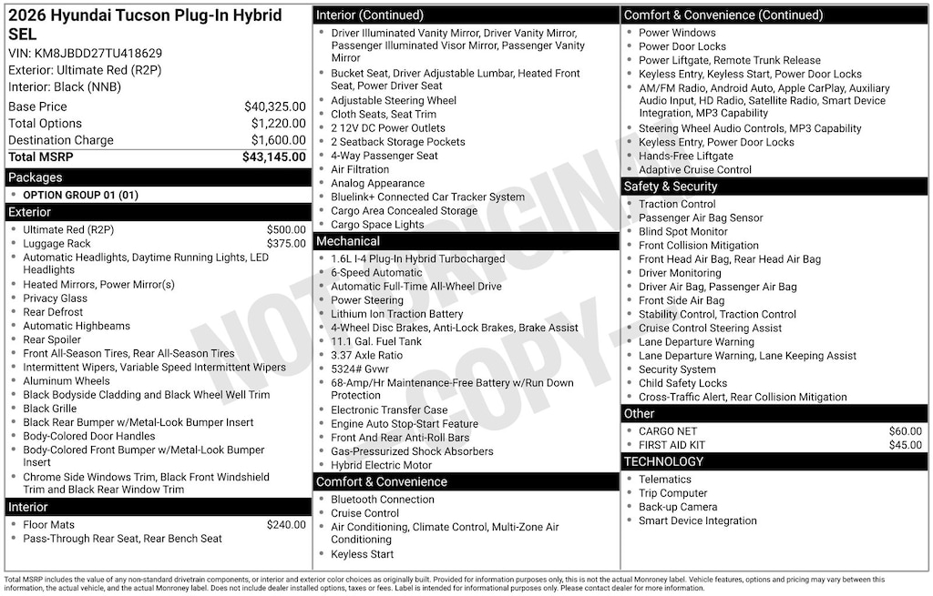 2026 Hyundai Tucson Plug-In Hybrid SEL 1.6L I4 DGI Hybrid Turbocharged DOHC 16V LEV3-SULEV30.