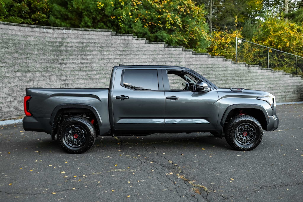 - "trd pro" hood badge; black door handles; black window molding and mirror caps; black "technical camo" grained tailgate spoiler and overfenders with marker lights.