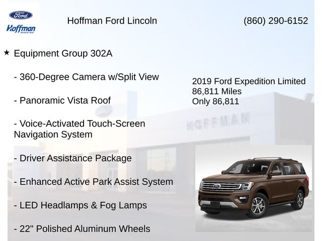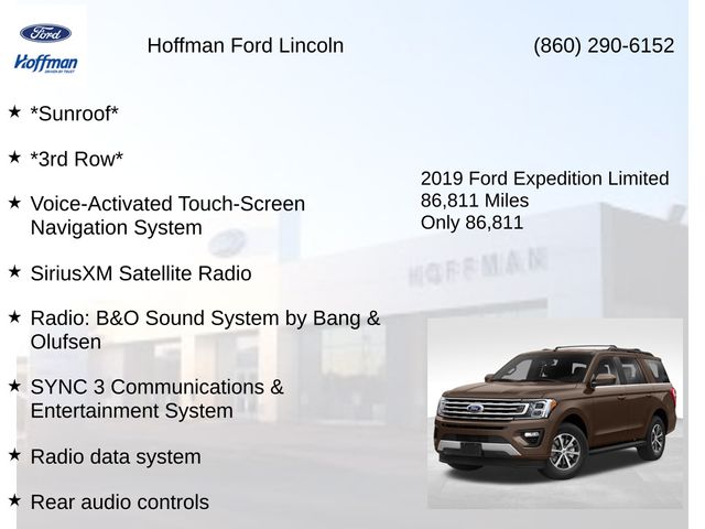 *Sunroof*, *3rd Row*, Expedition Limited, Stone Gray, 12 Speakers, 1st & 2nd Row Floor Liners, 22" Polished Aluminum Wheels, 3.31 Axle Ratio, 360-Degree Camera w/Split View, 3rd row seats: split-bench, 4-Wheel Disc Brakes, ABS brakes, Adaptive Cruise Control, Adjustable pedals, Air Conditioning, AM/FM radio: SiriusXM, AppLink/Apple CarPlay and Android Auto, Auto-dimming door mirrors, Auto-dimming Rear-View mirror, Automatic High Beam Headlamps, Automatic temperature control, Black Roof Rail Crossbars, Brake assist, Bumpers: body-color, Cargo Package, Compass, Delay-off headlights, Driver Assistance Package, Driver door bin, Driver vanity mirror, Dual front impact airbags, Dual front side impact airbags, Electronic Stability Control, Emergency communication system: SYNC 3 911 Assist, Enhanced Active Park Assist System, Equipment Group 302A, Exterior Parking Camera Rear, Four wheel independent suspension, Front anti-roll bar, Front Bucket Seats, Front Center Armrest, Front dual zone A/C, Front fog lights, Front reading lights, Fully automatic headlights, Garage door transmitter, Heated & Cooled Leather Front Bucket Seats, Heated door mirrors, Heated front seats, Heated rear seats, Heated steering wheel, Illuminated entry, Lane-Keeping System, Leather steering wheel, LED Headlamps & Fog Lamps, Low tire pressure warning, Memory seat, Occupant sensing airbag, Outside temperature display, Overhead airbag, Overhead console, Panic alarm, Panoramic Vista Roof, Passenger vanity mirror, Pedal memory, Power door mirrors, Power driver seat, Power Liftgate, Power passenger seat, Power steering, Power windows, Pre-Collision Assist, Radio data system, Radio: B&O Sound System by Bang & Olufsen, Rain-Sensing Front Wipers, Rear air conditioning, Rear anti-roll bar, Rear audio controls, Rear reading lights, Rear window defroster, Rear window wiper, Reclining 3rd row seat, Remote keyless entry, Security system, SiriusXM Satellite Radio, Speed-sensing steering, Speed-Sensitive Wipers, Split folding rear seat, Steering wheel memory, Steering wheel mounted audio controls, SYNC 3 Communications & Entertainment System, Tachometer, Telescoping steering wheel, Tilt steering wheel, Traction control, Trip computer, Turn signal indicator mirrors, Variably intermittent wipers, Ventilated front seats, Voice-Activated Touch-Screen Navigation System, Voltmeter.
