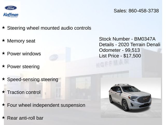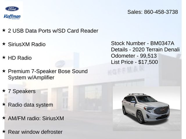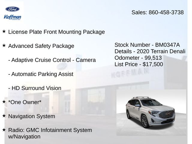 *One Owner*, Terrain Denali, White Frost Tricoat, 2 USB Data Ports, 2 USB Data Ports w/SD Card Reader, 4-Wheel Disc Brakes, 6-Way Power Front Passenger Seat, 7 Speakers, 8-Way Power Driver Seat Adjuster, ABS brakes, Adaptive Cruise Control - Camera, Advanced Safety Package, Air Conditioning, AM/FM radio: SiriusXM, Apple CarPlay/Android Auto, Auto High-beam Headlights, Auto-dimming door mirrors, Auto-dimming Rear-View mirror, Automatic Parking Assist, Automatic temperature control, Bluetooth® For Phone, Brake assist, Bumpers: body-color, Comfort Package, Compass, Delay-off headlights, Denali Premium Package, Driver & Front Passenger Heated Seats, Driver door bin, Driver vanity mirror, Dual front impact airbags, Dual front side impact airbags, Electronic Stability Control, Emergency communication system: OnStar and GMC connected services capable, Exterior Parking Camera Rear, Four wheel independent suspension, Front anti-roll bar, Front Bucket Seats, Front Center Armrest, Front dual zone A/C, Front fog lights, Front Passenger 2-Way Power Lumbar, Front reading lights, Fully automatic headlights, Garage door transmitter, HD Radio, HD Surround Vision, Heated Rear Outboard Seating Positions, Heated steering wheel, Illuminated entry, Lane Departure Warning System, License Plate Front Mounting Package, Low tire pressure warning, Memory seat, Navigation System, Occupant sensing airbag, Outside temperature display, Overhead airbag, Overhead console, Panic alarm, Passenger vanity mirror, Power door mirrors, Power Driver Lumbar Control, Power driver seat, Power Liftgate, Power steering, Power windows, Preferred Equipment Group 5SA, Premium 7-Speaker Bose Sound System w/Amplifier, Radio data system, Radio: GMC Infotainment System w/Navigation, Rear anti-roll bar, Rear seat center armrest, Rear window defroster, Remote keyless entry, Security system, SiriusXM Radio, Skyscape Power Sunroof w/Power Sunscreen, Speed control, Speed-sensing steering, Steering wheel mounted audio controls, Tachometer, Telescoping steering wheel, Tilt steering wheel, Traction control, Trip computer, Turn signal indicator mirrors, Ventilated Driver Seat, Ventilated Front Passenger Seat, Wheels: 19" x 7.5" Ultra-Bright Machined Aluminum.