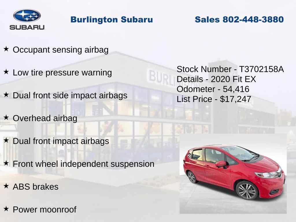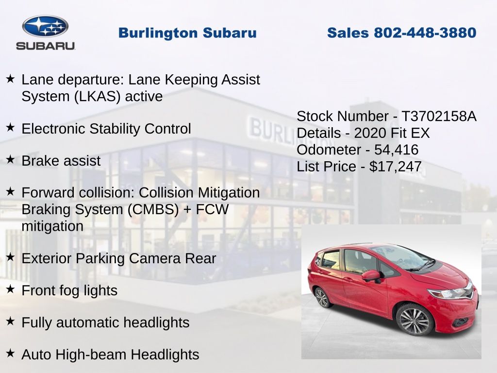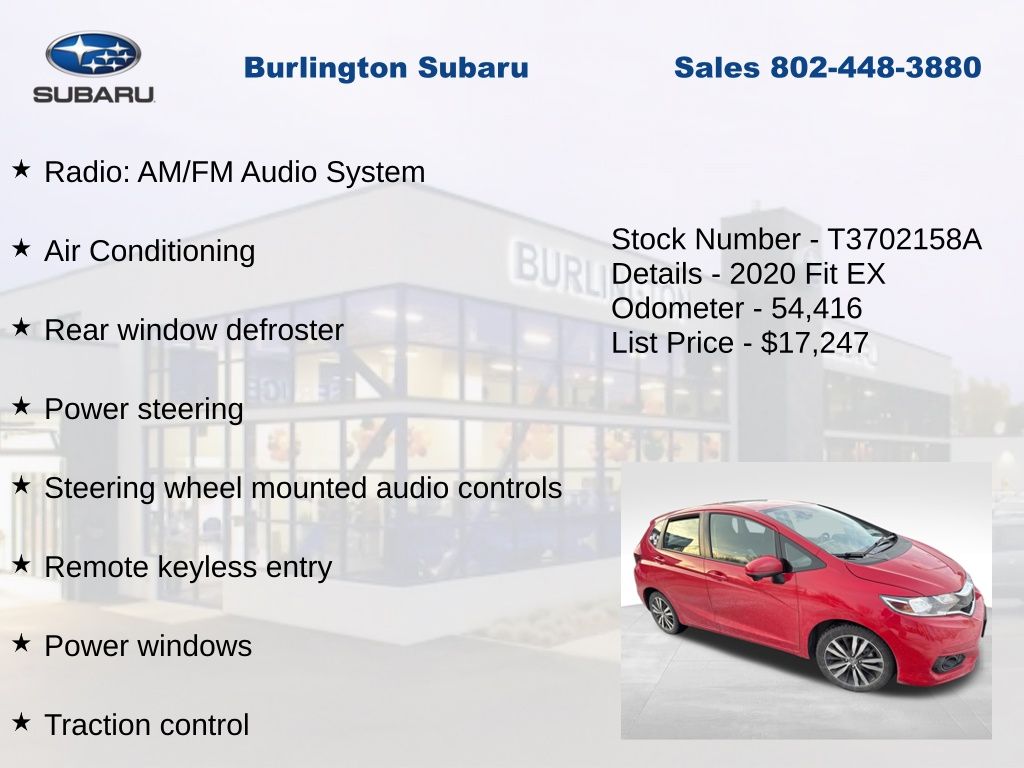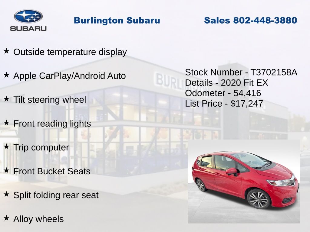 CARFAX One-Owner. Clean CARFAX. Honda Fit EX 2020 ABS brakes, Air Conditioning, Alloy wheels, Apple CarPlay/Android Auto, Auto High-beam Headlights, Brake assist, Driver vanity mirror, Dual front impact airbags, Dual front side impact airbags, Electronic Stability Control, Exterior Parking Camera Rear, Forward collision: Collision Mitigation Braking System (CMBS) + FCW mitigation, Front Bucket Seats, Front fog lights, Front reading lights, Front wheel independent suspension, Fully automatic headlights, Illuminated entry, Lane departure: Lane Keeping Assist System (LKAS) active, Low tire pressure warning, Occupant sensing airbag, Outside temperature display, Overhead airbag, Panic alarm, Passenger vanity mirror, Power door mirrors, Power moonroof, Power steering, Power windows, Radio: AM/FM Audio System, Rear window defroster, Rear window wiper, Remote keyless entry, Speed control, Split folding rear seat, Steering wheel mounted audio controls, Tachometer, Telescoping steering wheel, Tilt steering wheel, Traction control, Trip computer, Variably intermittent wipers.