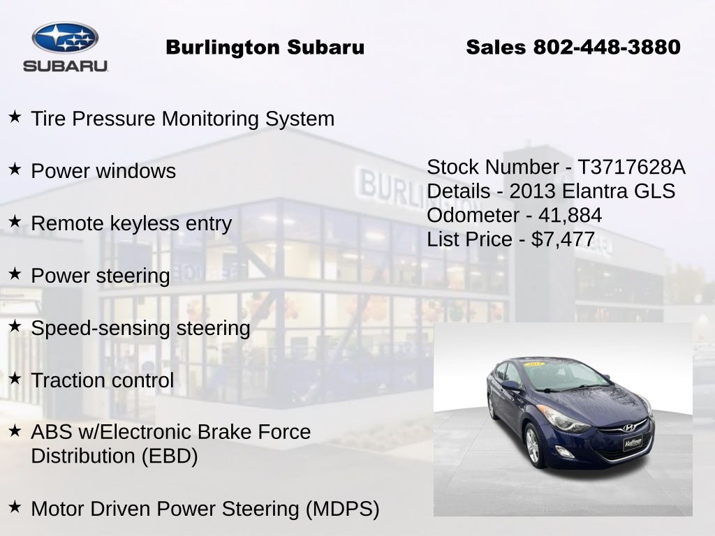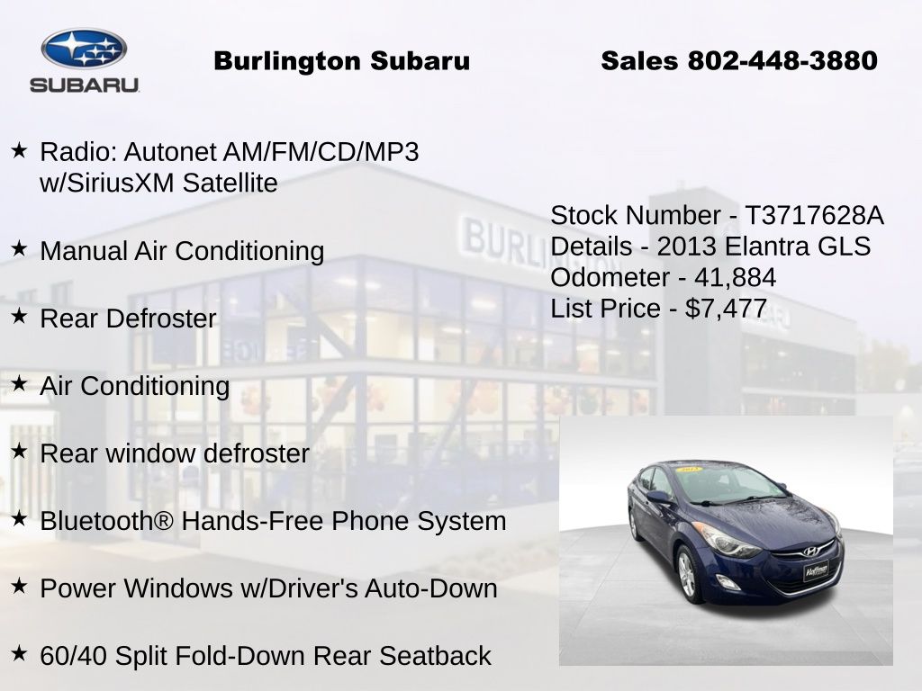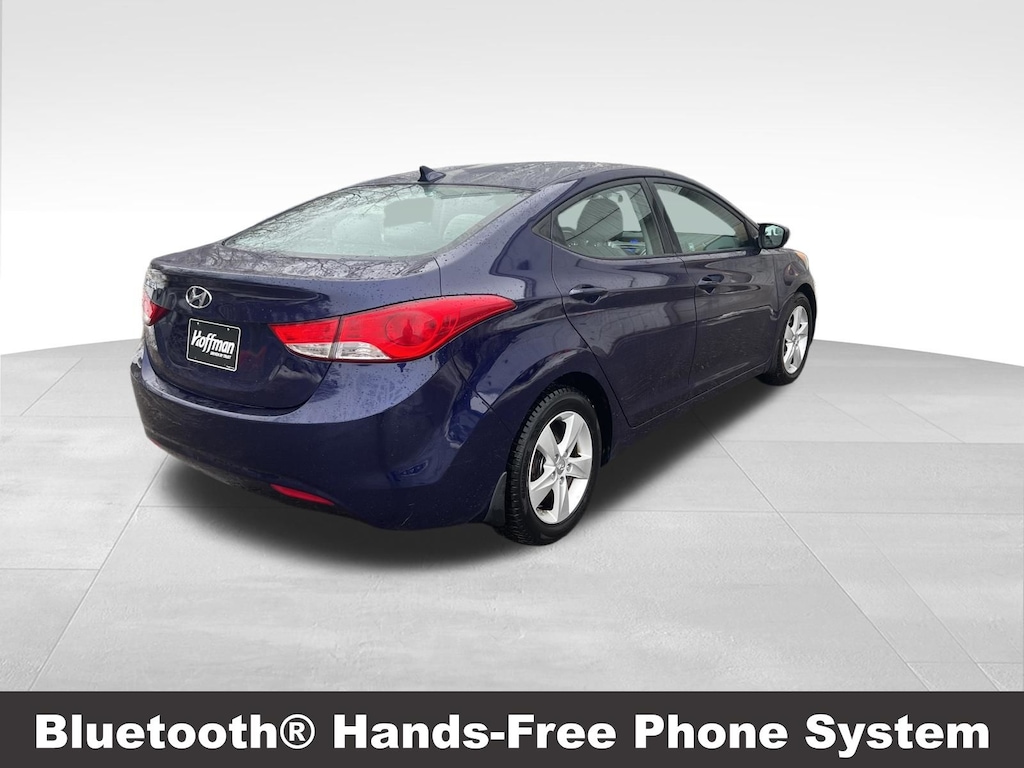 CARFAX One-Owner. Clean CARFAX. Hyundai Elantra GLS 2013 4-Wheel Disc Brakes, 60/40 Split Fold-Down Rear Seatback, ABS brakes, ABS w/Electronic Brake Force Distribution (EBD), Advanced Dual Front Airbags, Air Conditioning, Alloy wheels, Bluetooth® Hands-Free Phone System, Brake assist, Daytime Running Lights, Delay-off headlights, Dual front impact airbags, Dual front side impact airbags, Dual Heated Power Outside Mirrors, Electronic Stability Control, Front 2-Speed Intermittent Wipers, Front Fog Lights, Front reading lights, Front wheel independent suspension, Heated door mirrors, Heated Front Bucket Seats, Illuminated entry, Illuminated Vanity Mirrors w/Extensions, Low tire pressure warning, Manual Air Conditioning, Map & Cargo Area Lights, Motor Driven Power Steering (MDPS), Occupant sensing airbag, Outside temperature display, Overhead airbag, Panic alarm, Passenger vanity mirror, Power door mirrors, Power steering, Power windows, Power Windows w/Driver's Auto-Down, Premium Cloth Seating Surfaces, Radio: Autonet AM/FM/CD/MP3 w/SiriusXM Satellite, Rear Defroster, Rear window defroster, Remote keyless entry, Remote Keyless Entry System w/Alarm, Speed control, Speed-sensing steering, Split folding rear seat, Steering Wheel Mounted Cruise Control, Tachometer, Telescopic Steering Wheel, Telescoping steering wheel, Tilt Steering Wheel, Tilt steering wheel, Tire Pressure Monitoring System, Traction control, Traction Control System, Trip Computer, Trip computer, Variably intermittent wipers, Vehicle Stability Management. Odometer is 59275 miles below market average!