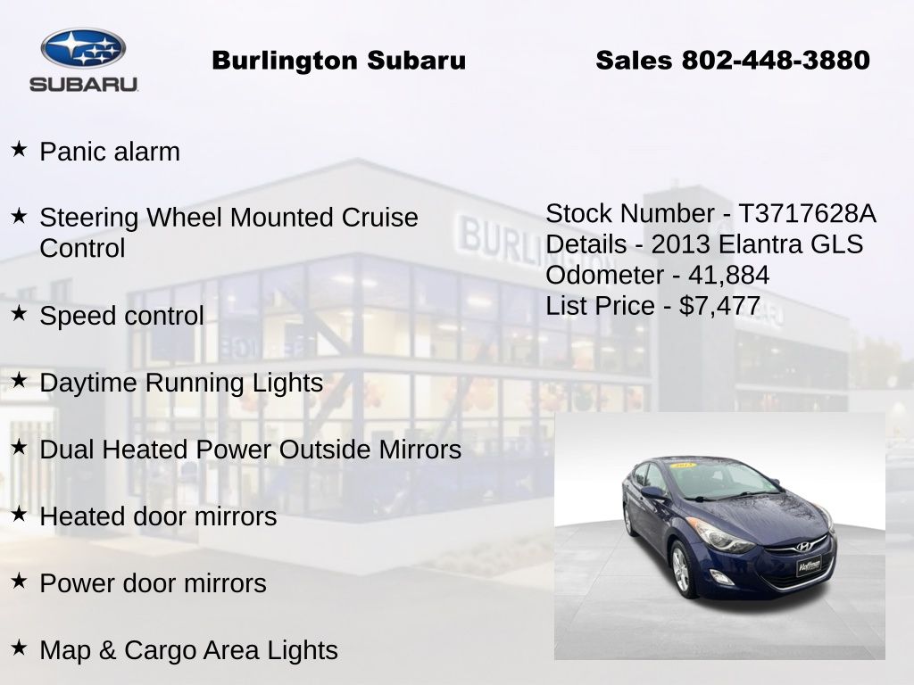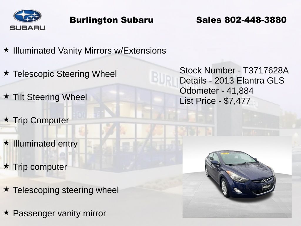 28/38 City/Highway MPG Burlington Subaru Hyundai is proud to be Burlington's premier dealership for new and used vehicles, servicing Vermont for over 25 years. In addition to a large inventory new and used Hyundai and Subaru vehicles, we also carry an extensive selection of other makes including Audi, BMW, Chevy, Chrysler, Dodge, Ford, GMC, Honda, Jeep, Nissan, Saturn, Scion, VW and more! Come test drive one today! Our friendly and experienced staff is ready to help you find your next new or used vehicle.