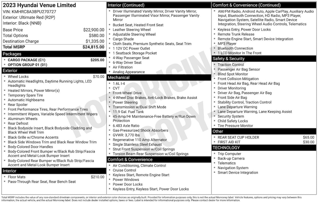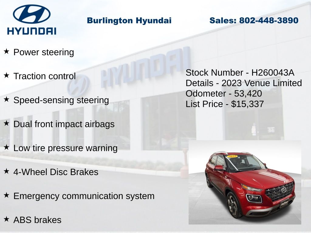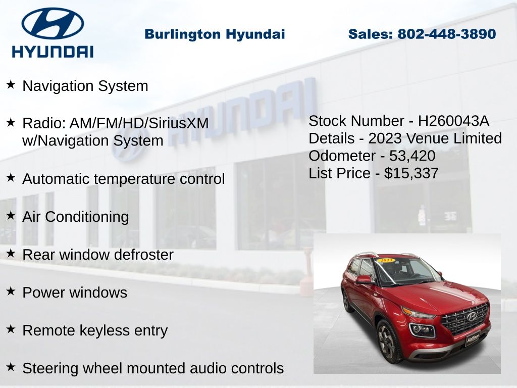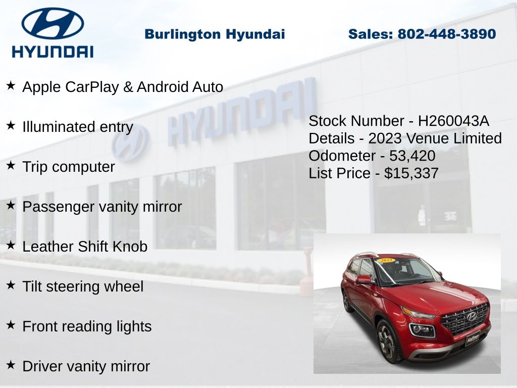2023 Venue Limited I4 FWD 29/33 City/Highway MPG Priced below KBB Fair Purchase Price! Clean CARFAX.