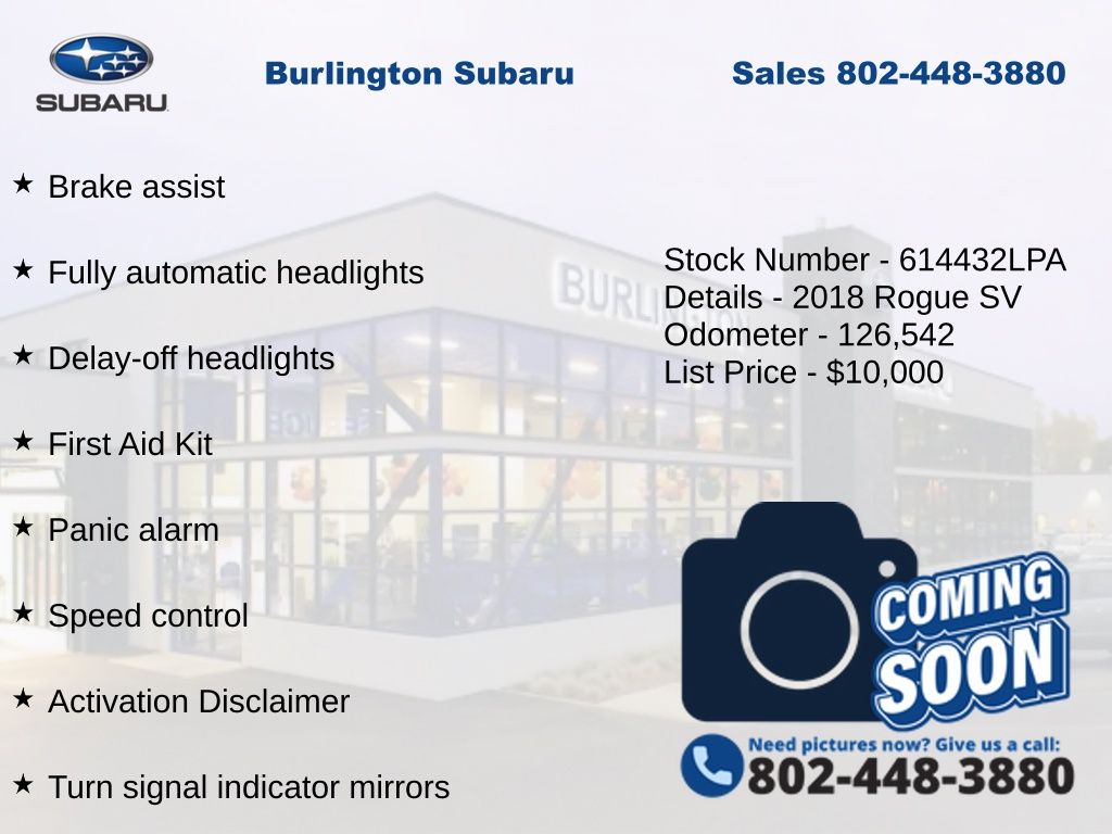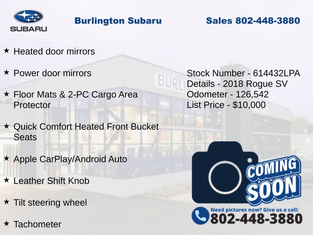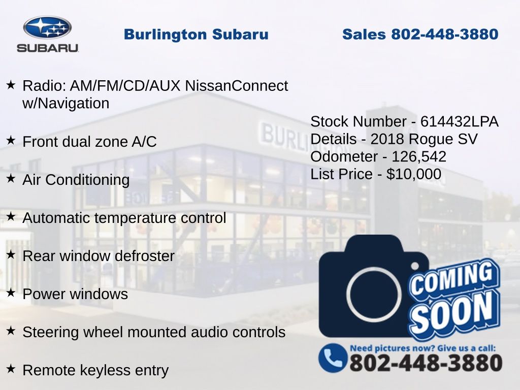 Nissan Rogue SV 2018 4-Wheel Disc Brakes, ABS brakes, Activation Disclaimer, Air Conditioning, Alloy wheels, Anti-whiplash front head restraints, Apple CarPlay/Android Auto, Automatic temperature control, Blind Spot Warning, Brake assist, Delay-off headlights, Driver vanity mirror, Dual front impact airbags, Dual front side impact airbags, Electronic Stability Control, First Aid Kit, Floor Mats & 2-PC Cargo Area Protector, Four wheel independent suspension, Front dual zone A/C, Fully automatic headlights, Heated door mirrors, Heated front seats, Leather Shift Knob, Low tire pressure warning, Occupant sensing airbag, Overhead airbag, Panic alarm, Power door mirrors, Power driver seat, Power Liftgate, Power steering, Power windows, Quick Comfort Heated Front Bucket Seats, Radio: AM/FM/CD/AUX NissanConnect w/Navigation, Rear window defroster, Rear window wiper, Remote keyless entry, Speed control, Speed-sensing steering, Split folding rear seat, Steering wheel mounted audio controls, Tachometer, Telescoping steering wheel, Tilt steering wheel, Traction control, Trip computer, Turn signal indicator mirrors, Variably intermittent wipers.