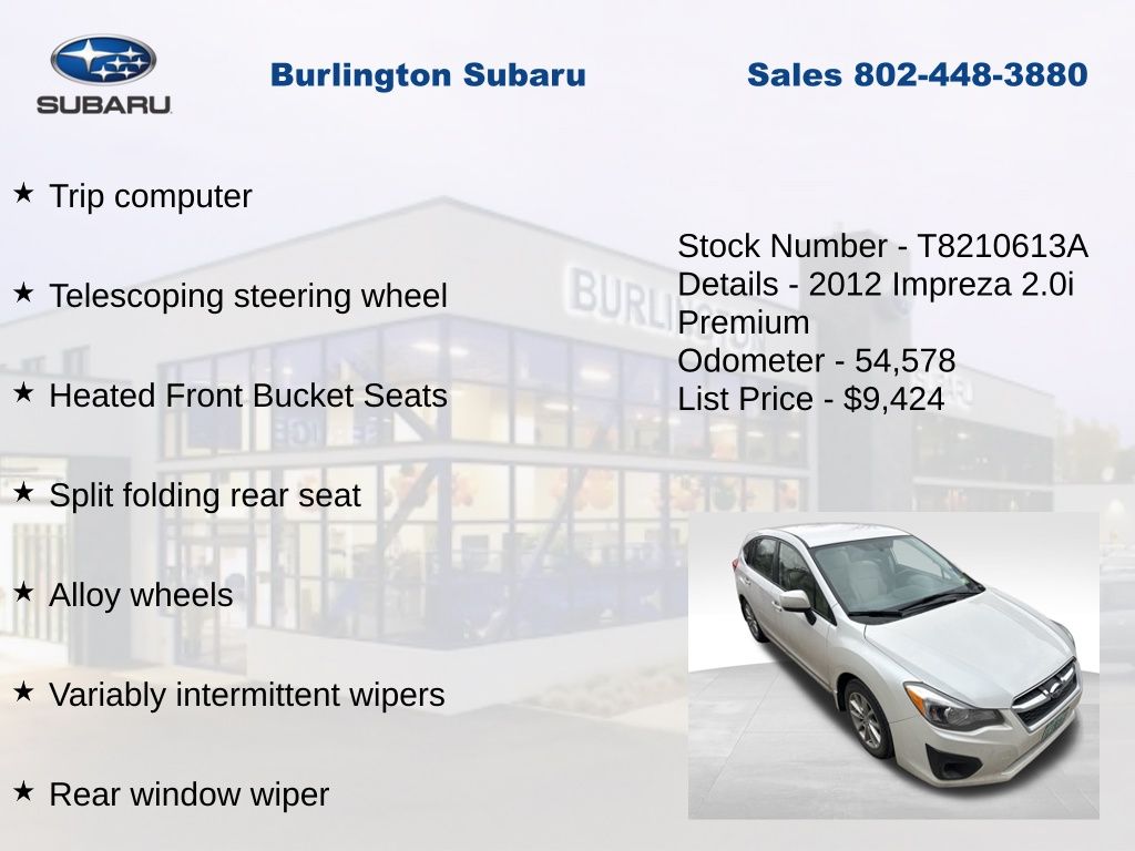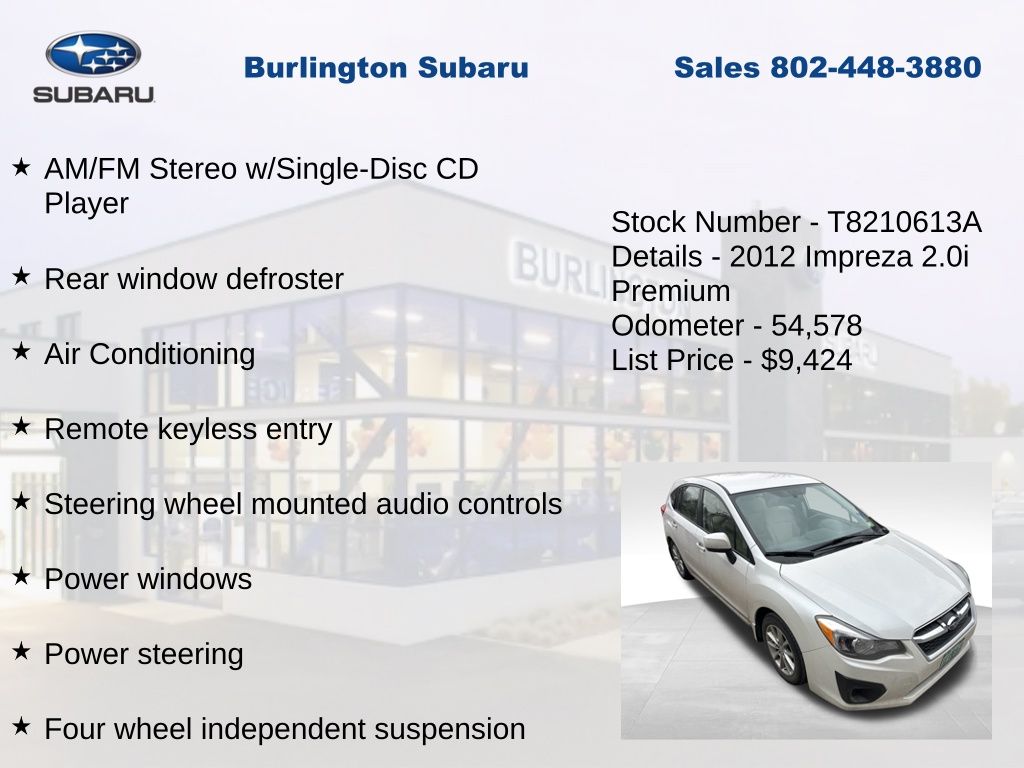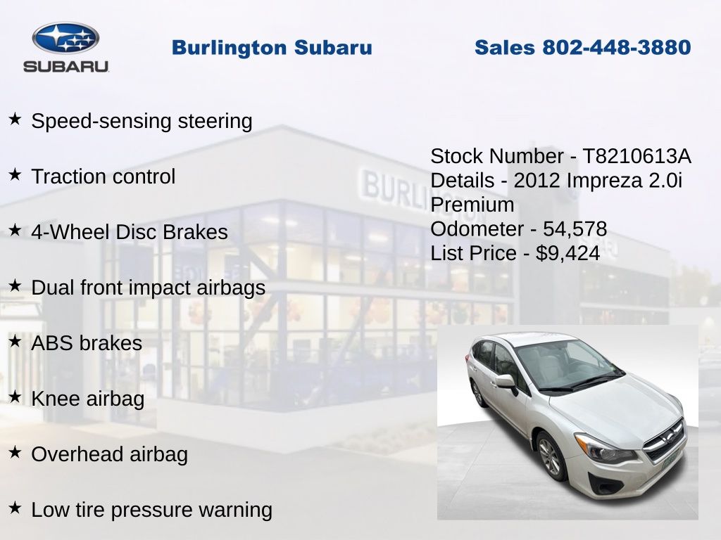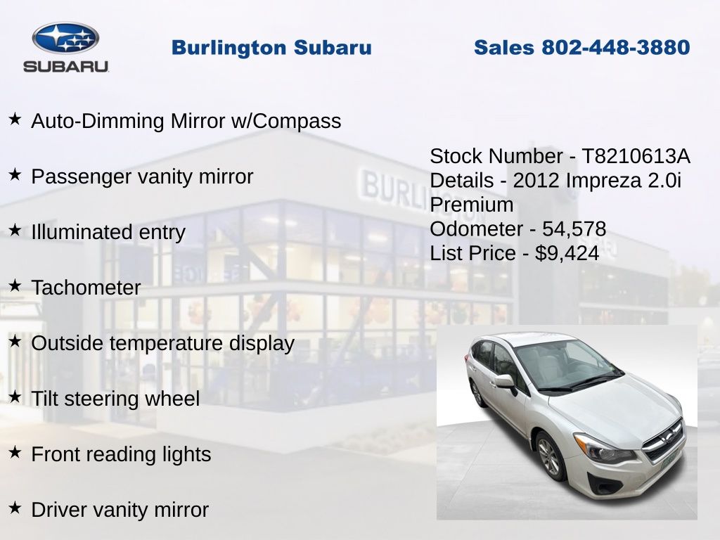 CARFAX One-Owner. Subaru Impreza 2.0i Premium 2012 4-Wheel Disc Brakes, ABS brakes, Air Conditioning, Alloy wheels, AM/FM Stereo w/Single-Disc CD Player, Auto-Dimming Mirror w/Compass, Brake assist, Driver vanity mirror, Dual front impact airbags, Dual front side impact airbags, Electronic Stability Control, Four wheel independent suspension, Front reading lights, Heated Front Bucket Seats, Illuminated entry, Knee airbag, Leather Shift Knob, Low tire pressure warning, Occupant sensing airbag, Outside temperature display, Overhead airbag, Panic alarm, Passenger vanity mirror, Power door mirrors, Power steering, Power windows, Rear window defroster, Rear window wiper, Remote keyless entry, Speed control, Speed-sensing steering, Split folding rear seat, Steering wheel mounted audio controls, Tachometer, Telescoping steering wheel, Tilt steering wheel, Traction control, Trip computer, Variably intermittent wipers. Odometer is 58277 miles below market average!