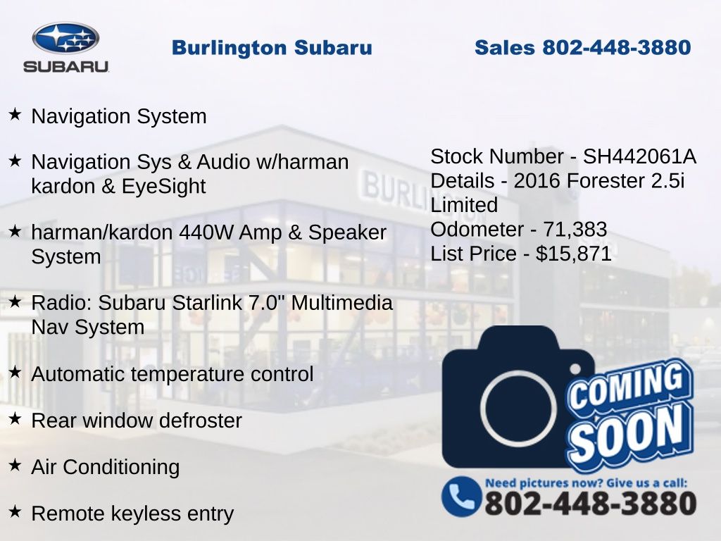 CARFAX One-Owner. Subaru Forester 2.5i Limited 2016 4-Wheel Disc Brakes, ABS brakes, Air Conditioning, Alloy wheels, Automatic temperature control, Brake assist, Driver vanity mirror, Dual front impact airbags, Dual front side impact airbags, Electronic Stability Control, Exterior Parking Camera Rear, EyeSight System, Four wheel independent suspension, Front fog lights, Front reading lights, Fully automatic headlights, harman/kardon 440W Amp & Speaker System, Heated door mirrors, Heated Front Bucket Seats, Illuminated entry, Knee airbag, Leather Shift Knob, Low tire pressure warning, Navigation Sys & Audio w/harman kardon & EyeSight, Navigation System, Occupant sensing airbag, Outside temperature display, Overhead airbag, Panic alarm, Passenger vanity mirror, Perforated Leather-Trimmed Upholstery, Power door mirrors, Power driver seat, Power Liftgate, Power moonroof, Power steering, Power windows, Radio: Subaru Starlink 7.0" Multimedia Nav System, Rear window defroster, Rear window wiper, Remote keyless entry, Smartphone Integration, Speed control, Split folding rear seat, Steering Responsive Fog Lights (SRF), Steering wheel mounted audio controls, Tachometer, Telescoping steering wheel, Tilt steering wheel, Traction control, Trip computer, Variably intermittent wipers. Odometer is 36827 miles below market average!