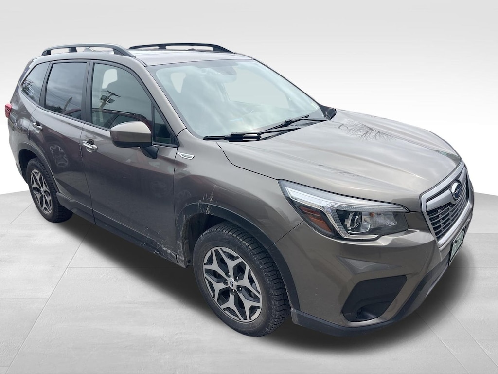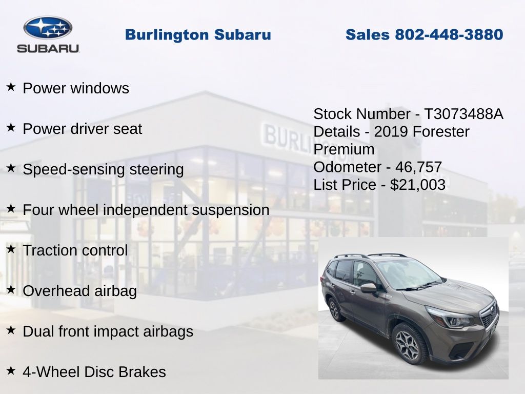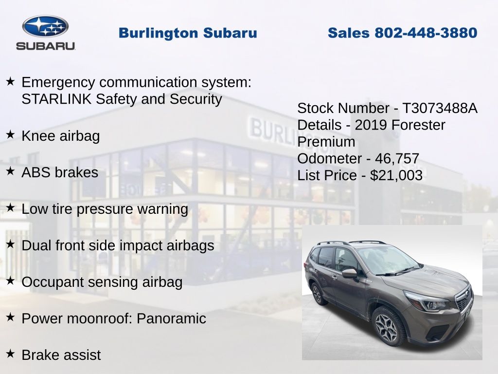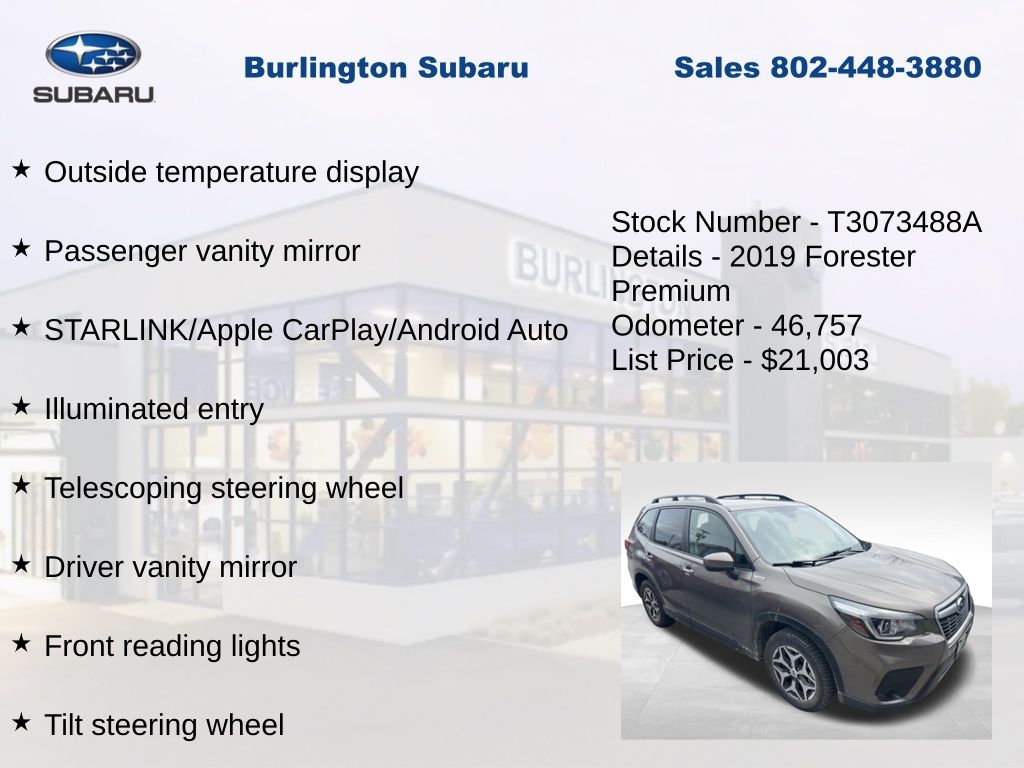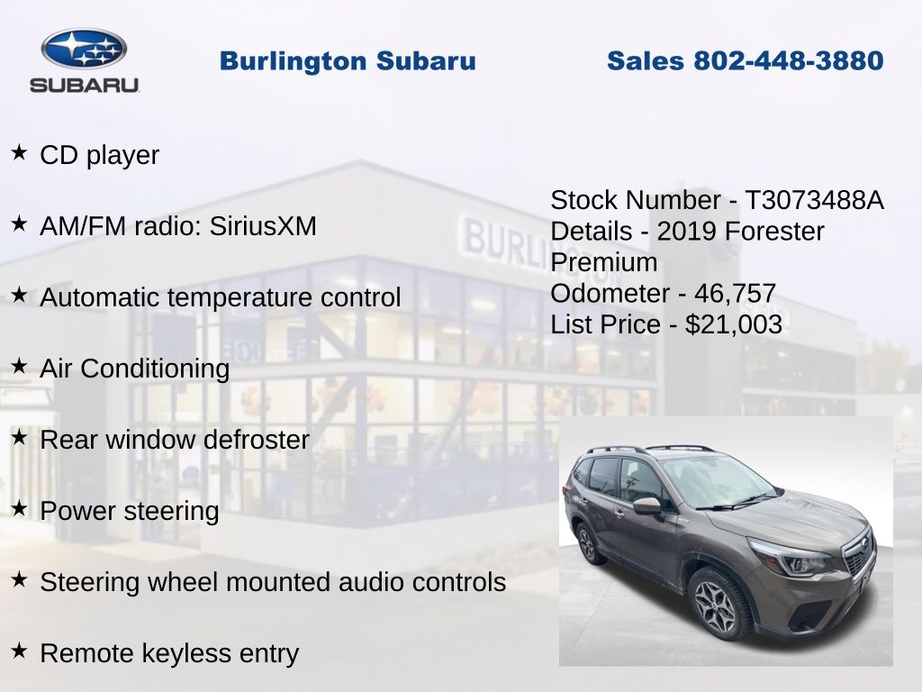 Clean CARFAX. Subaru Forester Premium 2019 4-Wheel Disc Brakes, ABS brakes, Air Conditioning, Alloy wheels, AM/FM radio: SiriusXM, Automatic temperature control, Brake assist, CD player, Driver vanity mirror, Dual front impact airbags, Dual front side impact airbags, Electronic Stability Control, Emergency communication system: STARLINK Safety and Security, Exterior Parking Camera Rear, Four wheel independent suspension, Front Bucket Seats, Front reading lights, Fully automatic headlights, Heated Exterior Mirrors, Heated Front Seats, Illuminated entry, Knee airbag, Low tire pressure warning, Occupant sensing airbag, Outside temperature display, Overhead airbag, Panic alarm, Passenger vanity mirror, Power door mirrors, Power driver seat, Power moonroof: Panoramic, Power steering, Power windows, Rear window defroster, Rear window wiper, Remote keyless entry, Speed control, Speed-sensing steering, Split folding rear seat, STARLINK/Apple CarPlay/Android Auto, Steering wheel mounted audio controls, Tachometer, Telescoping steering wheel, Tilt steering wheel, Traction control, Variably intermittent wipers, Windshield Wiper De-Icer. Odometer is 25152 miles below market average!