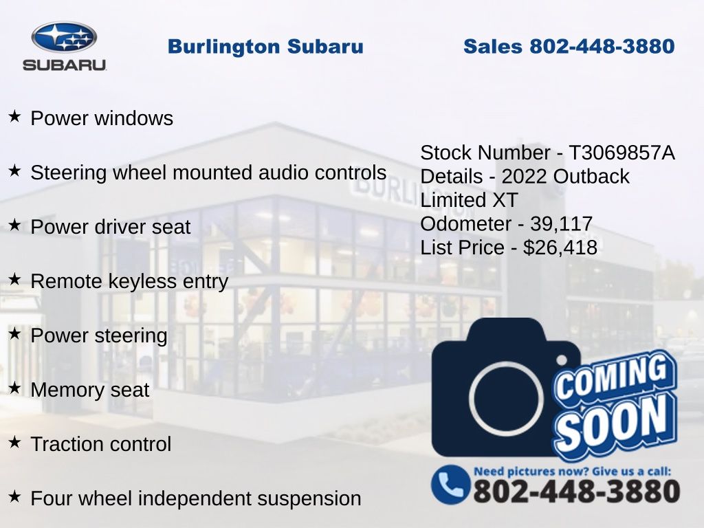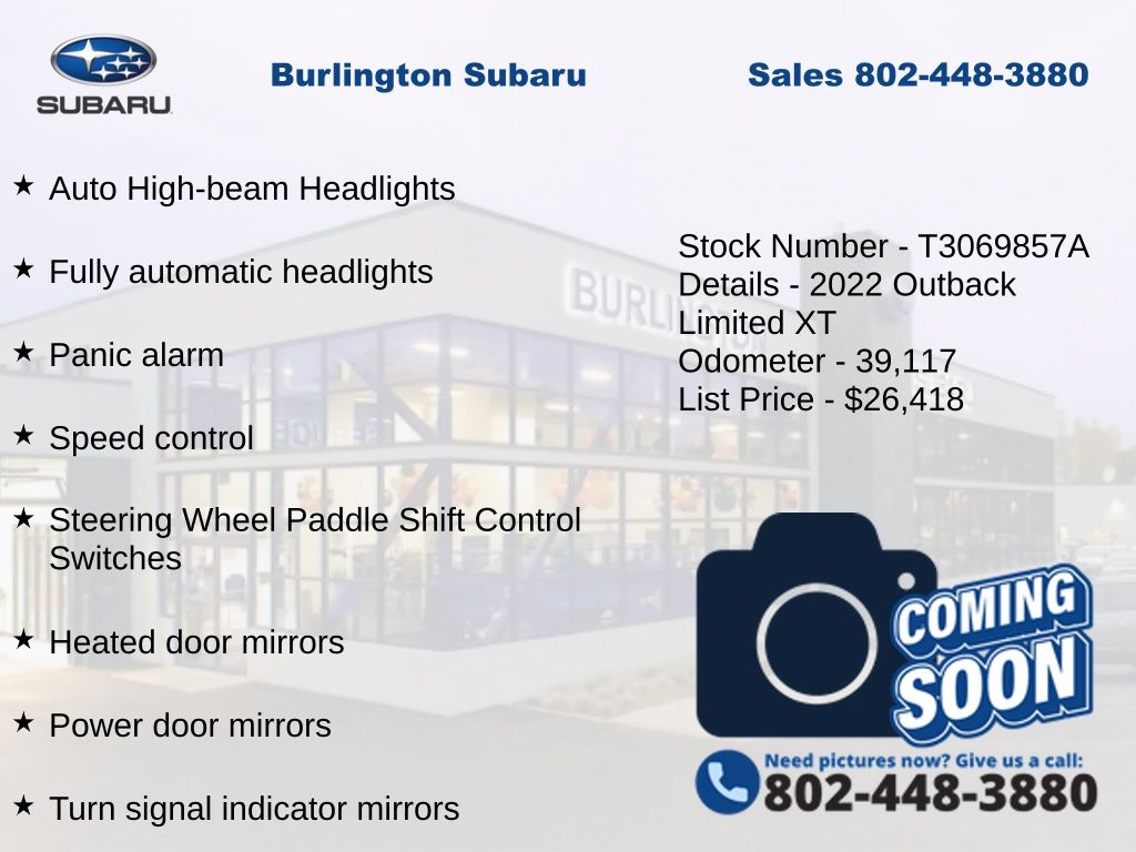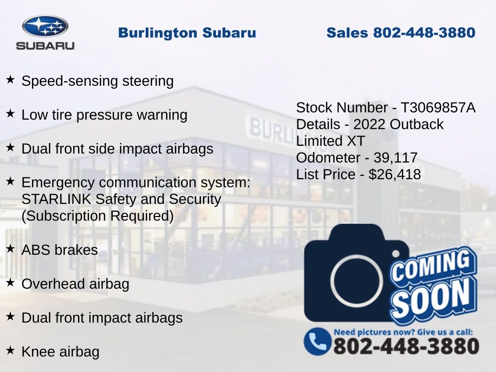CARFAX One-Owner. Clean CARFAX. Subaru Outback Limited XT 2022 4-Wheel Disc Brakes, ABS brakes, Air Conditioning, Alloy wheels, AM/FM radio: SiriusXM, Auto High-beam Headlights, Auto-dimming Rear-View mirror, Automatic temperature control, Brake assist, Compass, Dome Light LED Upgrade, Driver vanity mirror, Dual front impact airbags, Dual front side impact airbags, Electronic Stability Control, Emergency communication system: STARLINK Safety and Security (Subscription Required), Exterior Parking Camera Rear, Four wheel independent suspension, Front dual zone A/C, Front fog lights, Front reading lights, Fully automatic headlights, Garage door transmitter: HomeLink, Heated door mirrors, Heated Front Bucket Seats, Heated rear seats, Heated steering wheel, HVAC memory, Illuminated entry, Knee airbag, Leather steering wheel, Low tire pressure warning, Memory seat, Navigation System, Occupant sensing airbag, Outside temperature display, Overhead airbag, Panic alarm, Passenger vanity mirror, Perforated Leather-Trimmed Upholstery, Power door mirrors, Power driver seat, Power Liftgate, Power moonroof, Power passenger seat, Power steering, Power windows, Radio: Subaru STARLINK 11.6" Multimedia Nav System, Rear window defroster, Rear window wiper, Remote keyless entry, Speed control, Speed-sensing steering, Split folding rear seat, STARLINK/Apple CarPlay/Android Auto, Steering wheel mounted audio controls, Steering Wheel Paddle Shift Control Switches, Tachometer, Telescoping steering wheel, Tilt steering wheel, Traction control, Trip computer, Turn signal indicator mirrors, Variably intermittent wipers. Odometer is 13367 miles below market average!