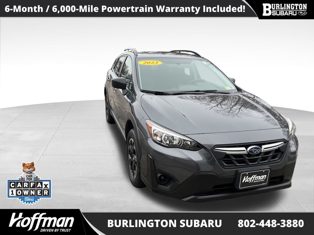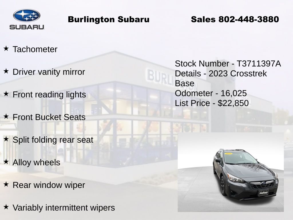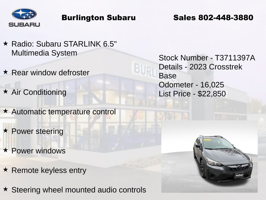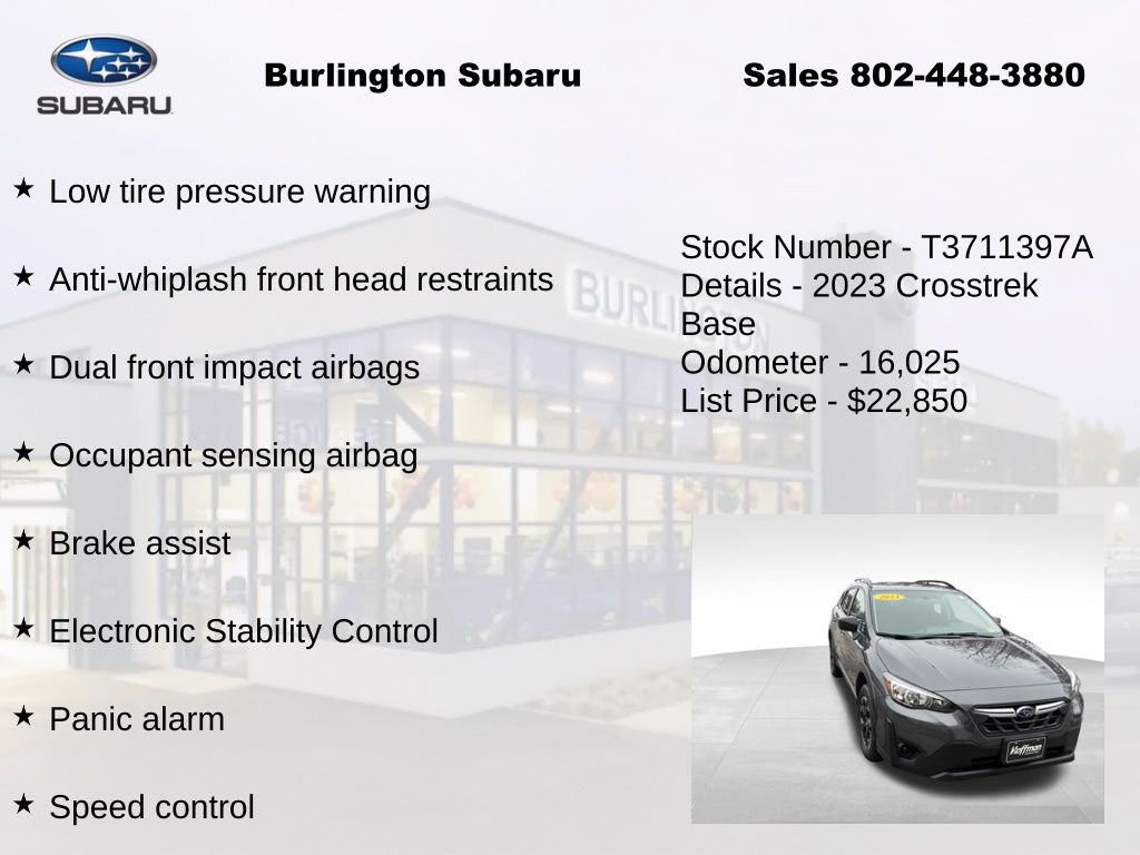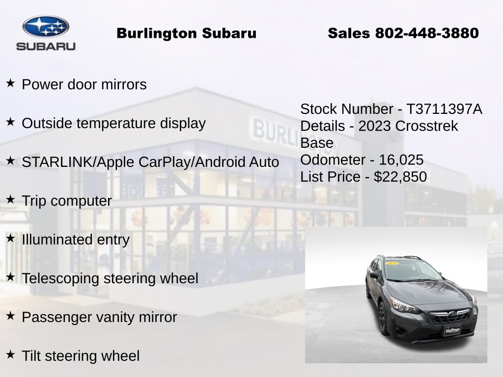 CARFAX One-Owner. Clean CARFAX. Subaru Crosstrek 2023 4-Wheel Disc Brakes, ABS brakes, Air Conditioning, Alloy wheels, Anti-whiplash front head restraints, Automatic temperature control, Brake assist, Driver vanity mirror, Dual front impact airbags, Dual front side impact airbags, Electronic Stability Control, Four wheel independent suspension, Front Bucket Seats, Front reading lights, Illuminated entry, Knee airbag, Low tire pressure warning, Occupant sensing airbag, Outside temperature display, Overhead airbag, Panic alarm, Passenger vanity mirror, Power door mirrors, Power steering, Power windows, Radio: Subaru STARLINK 6.5" Multimedia System, Rear window defroster, Rear window wiper, Remote keyless entry, Speed control, Speed-sensing steering, Split folding rear seat, STARLINK/Apple CarPlay/Android Auto, Steering wheel mounted audio controls, Tachometer, Telescoping steering wheel, Tilt steering wheel, Traction control, Trip computer, Variably intermittent wipers. Odometer is 20211 miles below market average!