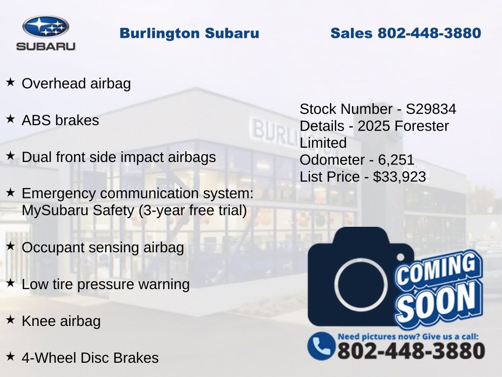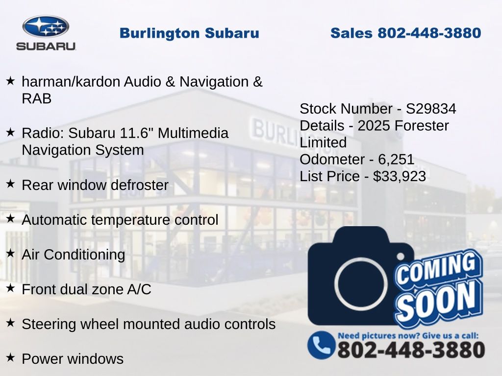 CARFAX One-Owner. Clean CARFAX. Subaru Forester Limited 2025 4-Wheel Disc Brakes, ABS brakes, Air Conditioning, Alloy wheels, Anti-whiplash front head restraints, Auto High-beam Headlights, Automatic temperature control, Brake assist, Driver vanity mirror, Dual front impact airbags, Dual front side impact airbags, Electronic Stability Control, Emergency communication system: MySubaru Safety (3-year free trial), Exterior Parking Camera Rear, Four wheel independent suspension, Front dual zone A/C, Front fog lights, Front reading lights, Fully automatic headlights, harman/kardon Audio & Navigation & RAB, Heated door mirrors, Heated Front Bucket Seats, Heated steering wheel, Illuminated entry, Knee airbag, Leather steering wheel, Low tire pressure warning, Occupant sensing airbag, Outside temperature display, Overhead airbag, Overhead console, Panic alarm, Passenger vanity mirror, Perforated Leather-Trimmed Upholstery, Power door mirrors, Power driver seat, Power Liftgate, Power moonroof: Panoramic, Power passenger seat, Power steering, Power windows, Radio: Subaru 11.6" Multimedia Navigation System, Rear window defroster, Rear window wiper, Remote keyless entry, Reverse Automatic Braking (RAB) System, Speed control, Speed-sensing steering, Split folding rear seat, Steering wheel mounted audio controls, Tachometer, Telescoping steering wheel, Tilt steering wheel, Traction control, Trip computer, Turn signal indicator mirrors, Variably intermittent wipers. Odometer is 8675 miles below market average!