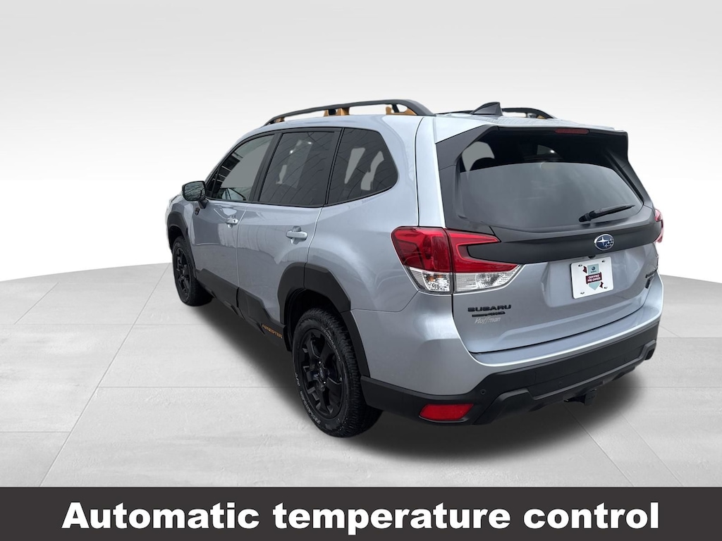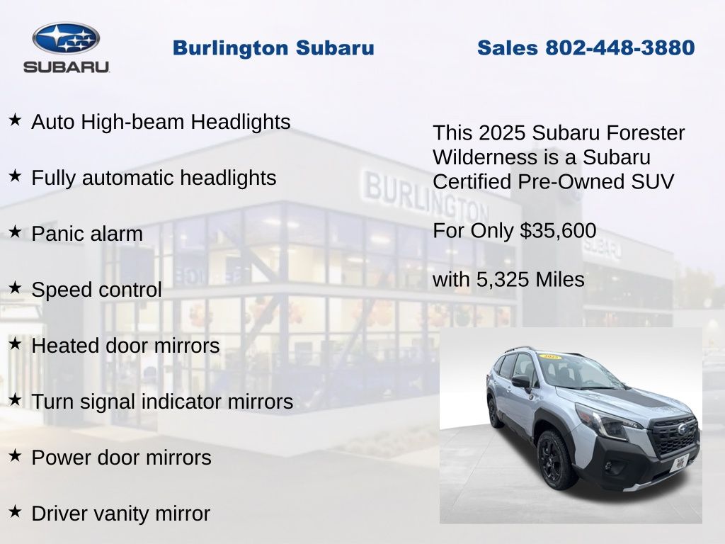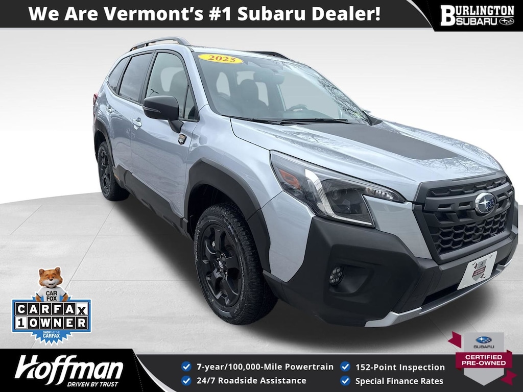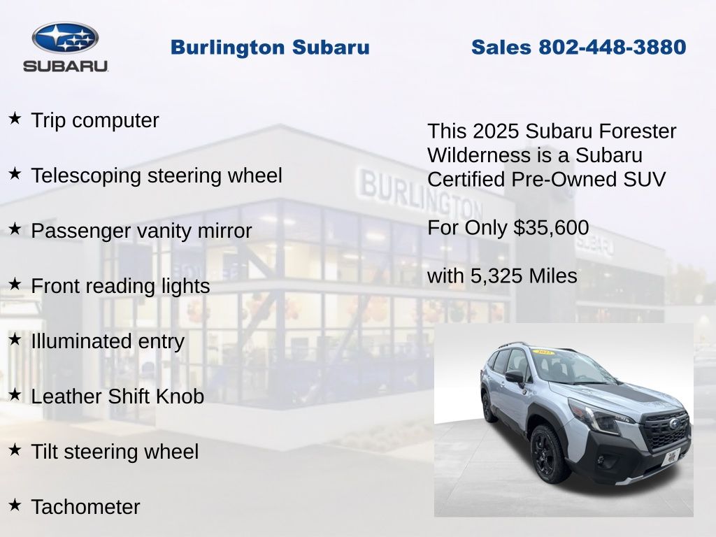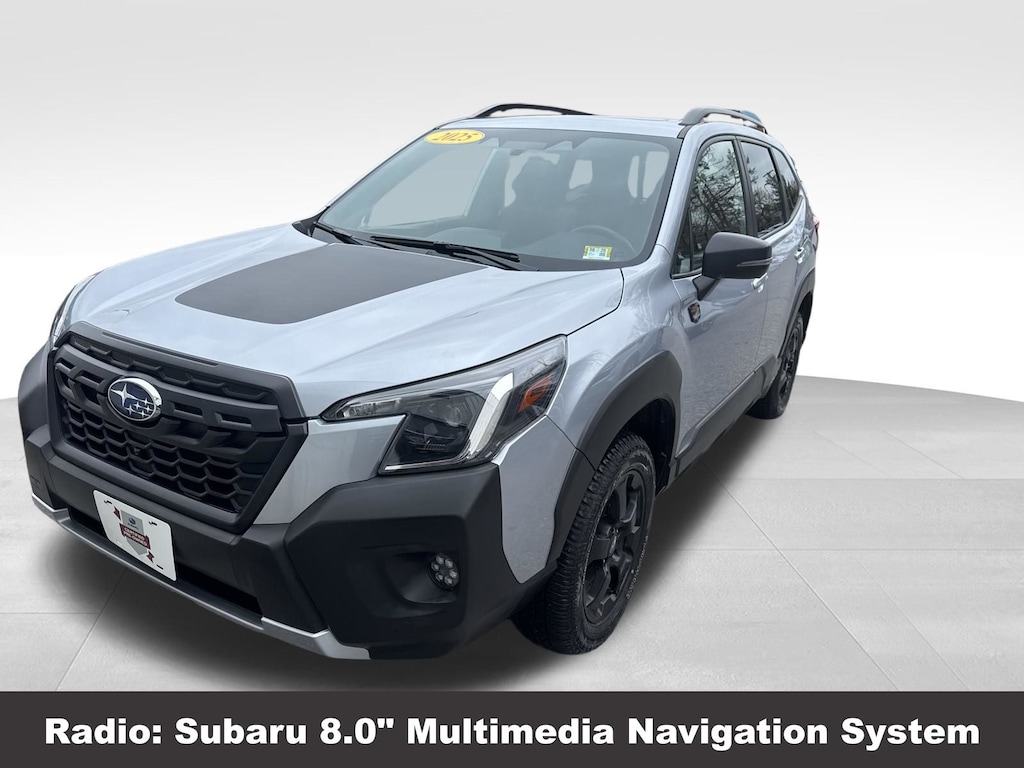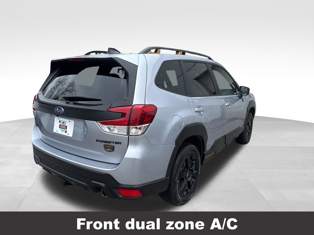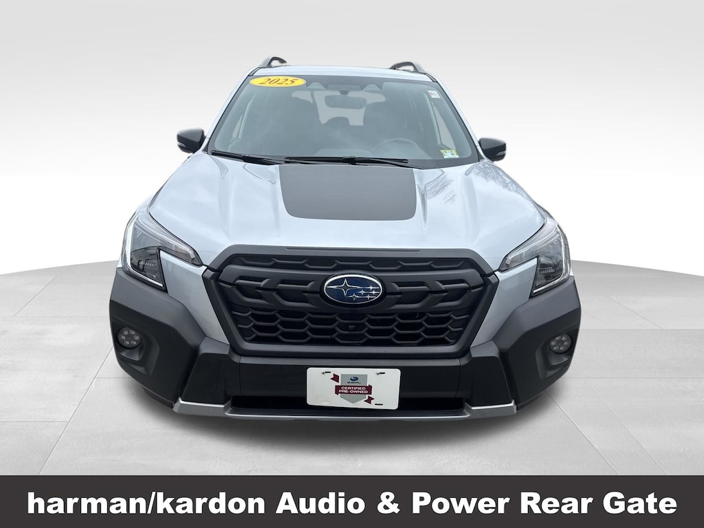 CARFAX One-Owner. Clean CARFAX. Subaru Forester Wilderness 2025 Certified. 4-Wheel Disc Brakes, ABS brakes, Air Conditioning, Alloy wheels, Anti-whiplash front head restraints, Auto High-beam Headlights, Automatic temperature control, Brake assist, Driver vanity mirror, Dual front impact airbags, Dual front side impact airbags, Electronic Stability Control, Emergency communication system: MySubaru Safety (3-year free trial), Exterior Parking Camera Rear, Four wheel independent suspension, Front dual zone A/C, Front fog lights, Front reading lights, Fully automatic headlights, harman/kardon Audio & Power Rear Gate, Heated door mirrors, Heated Front Bucket Seats, Illuminated entry, Knee airbag, Leather Shift Knob, Leather steering wheel, Low tire pressure warning, Occupant sensing airbag, Outside temperature display, Overhead airbag, Panic alarm, Passenger vanity mirror, Power door mirrors, Power driver seat, Power moonroof: Panoramic, Power Rear Gate, Power steering, Power windows, Radio: Subaru 8.0" Multimedia Navigation System, Rear window defroster, Rear window wiper, Remote keyless entry, Speed control, Speed-sensing steering, Split folding rear seat, Steering wheel mounted audio controls, Tachometer, Telescoping steering wheel, Textured StarTex Upholstery, Tilt steering wheel, Traction control, Trip computer, Turn signal indicator mirrors, Variably intermittent wipers.