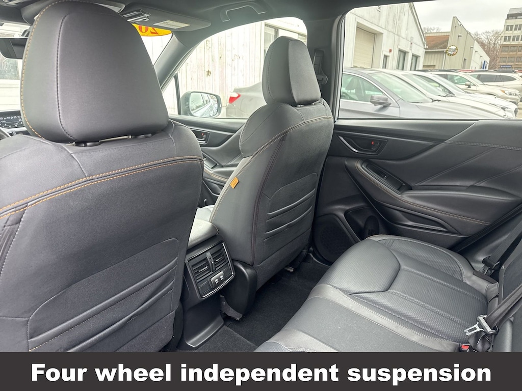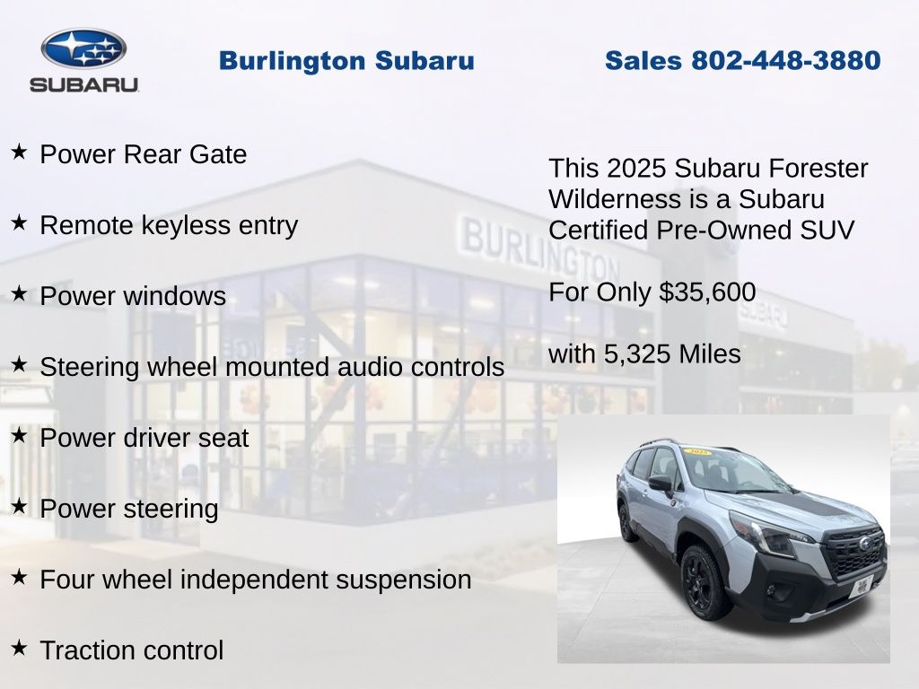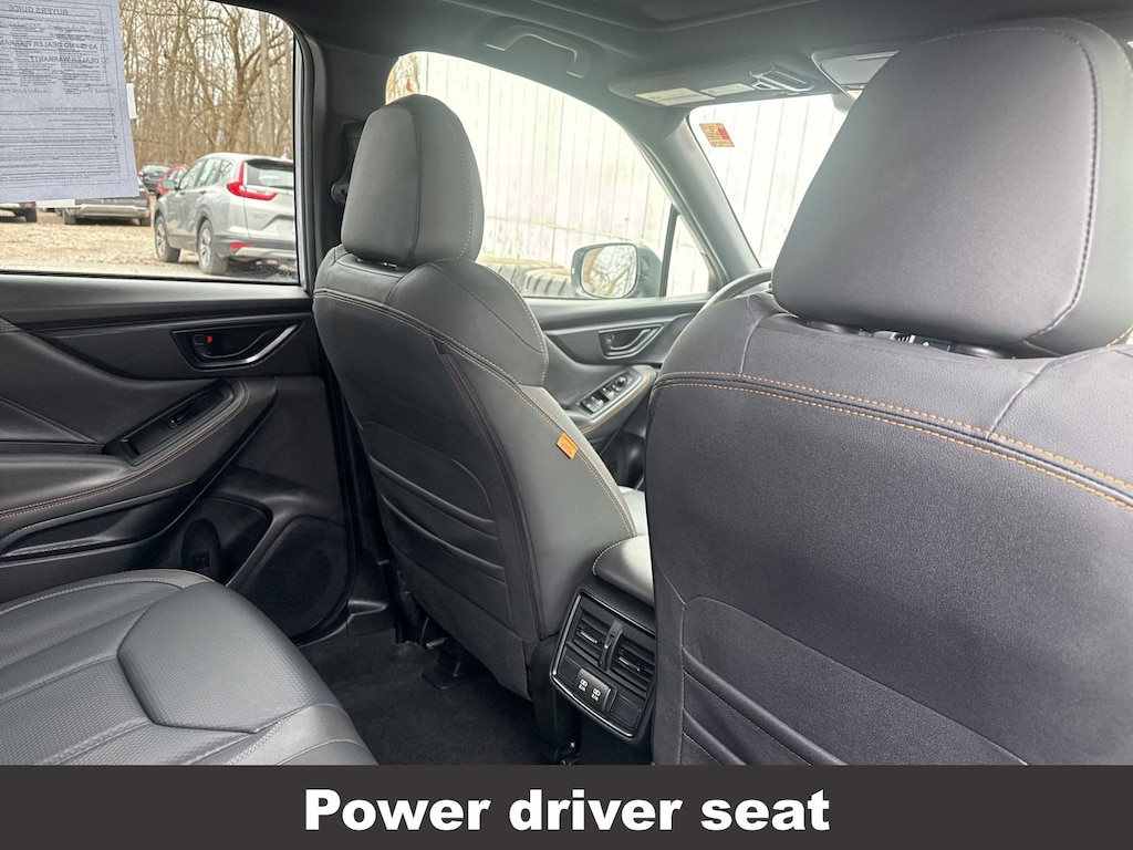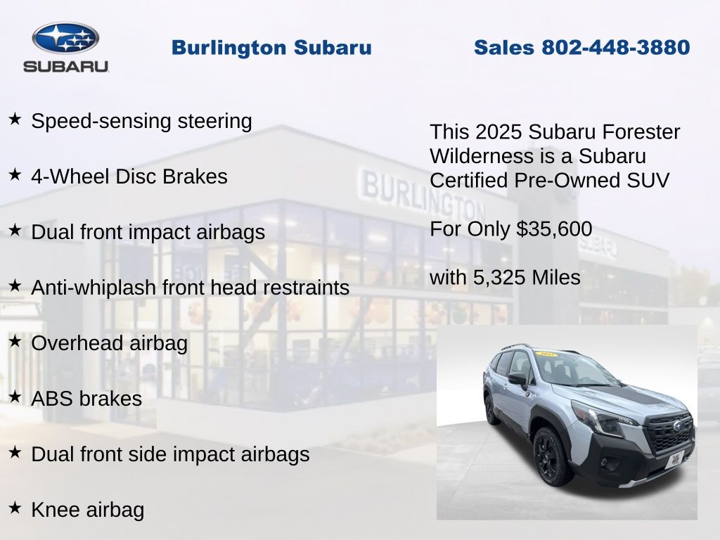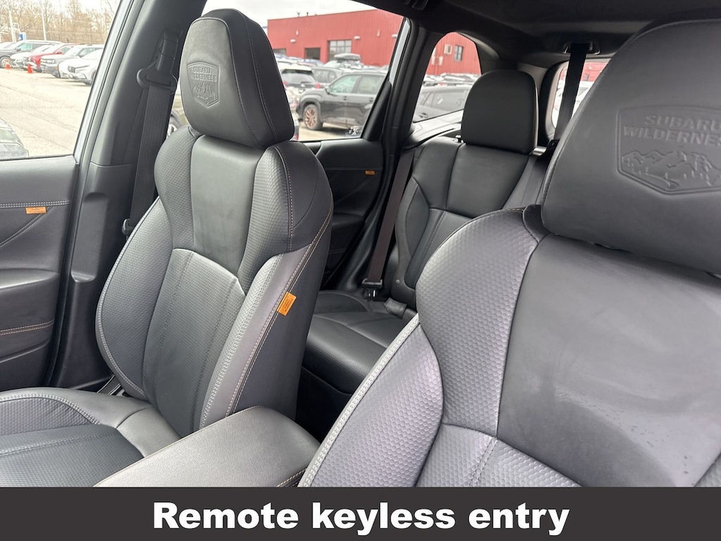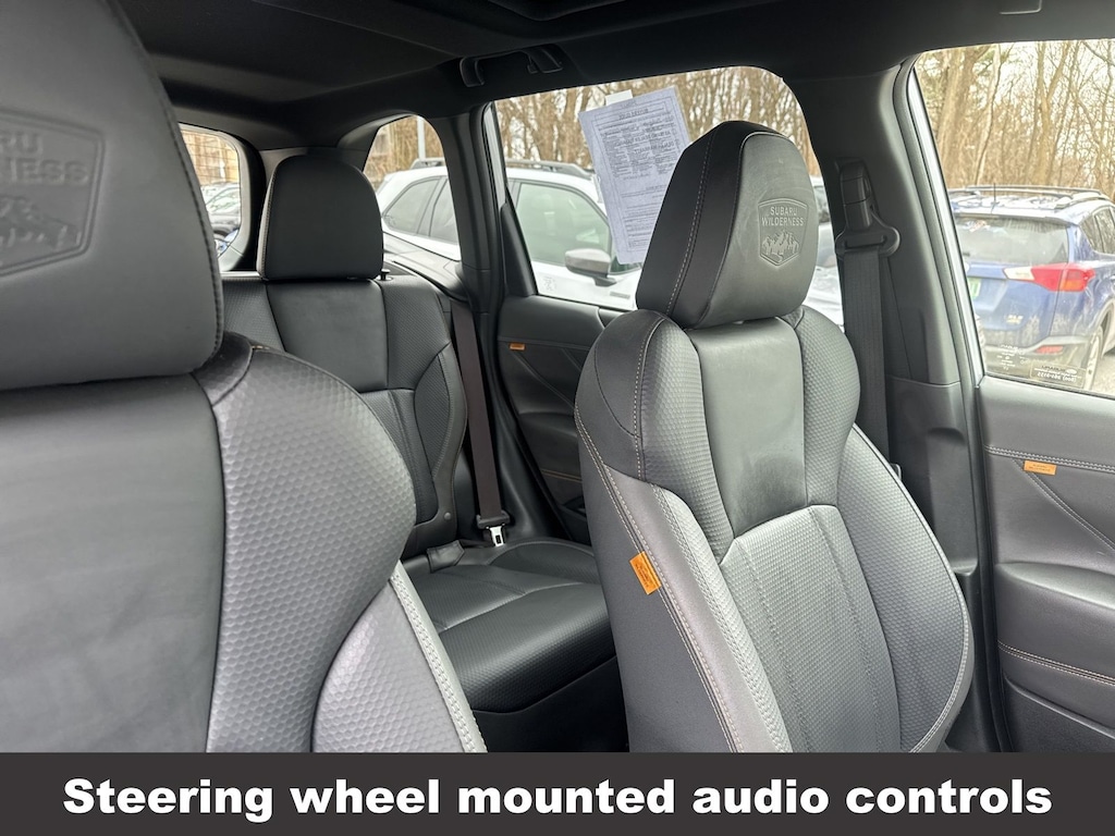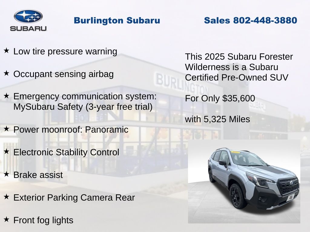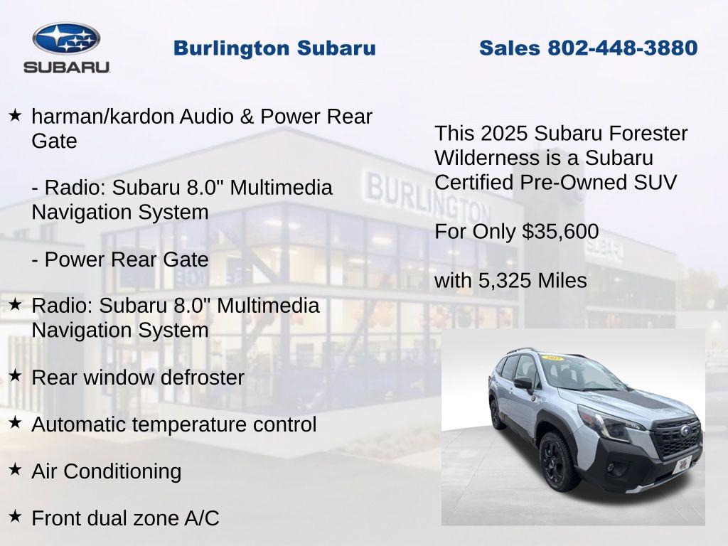 CARFAX One-Owner. Clean CARFAX. Subaru Forester Wilderness 2025 Certified. 4-Wheel Disc Brakes, ABS brakes, Air Conditioning, Alloy wheels, Anti-whiplash front head restraints, Auto High-beam Headlights, Automatic temperature control, Brake assist, Driver vanity mirror, Dual front impact airbags, Dual front side impact airbags, Electronic Stability Control, Emergency communication system: MySubaru Safety (3-year free trial), Exterior Parking Camera Rear, Four wheel independent suspension, Front dual zone A/C, Front fog lights, Front reading lights, Fully automatic headlights, harman/kardon Audio & Power Rear Gate, Heated door mirrors, Heated Front Bucket Seats, Illuminated entry, Knee airbag, Leather Shift Knob, Leather steering wheel, Low tire pressure warning, Occupant sensing airbag, Outside temperature display, Overhead airbag, Panic alarm, Passenger vanity mirror, Power door mirrors, Power driver seat, Power moonroof: Panoramic, Power Rear Gate, Power steering, Power windows, Radio: Subaru 8.0" Multimedia Navigation System, Rear window defroster, Rear window wiper, Remote keyless entry, Speed control, Speed-sensing steering, Split folding rear seat, Steering wheel mounted audio controls, Tachometer, Telescoping steering wheel, Textured StarTex Upholstery, Tilt steering wheel, Traction control, Trip computer, Turn signal indicator mirrors, Variably intermittent wipers.