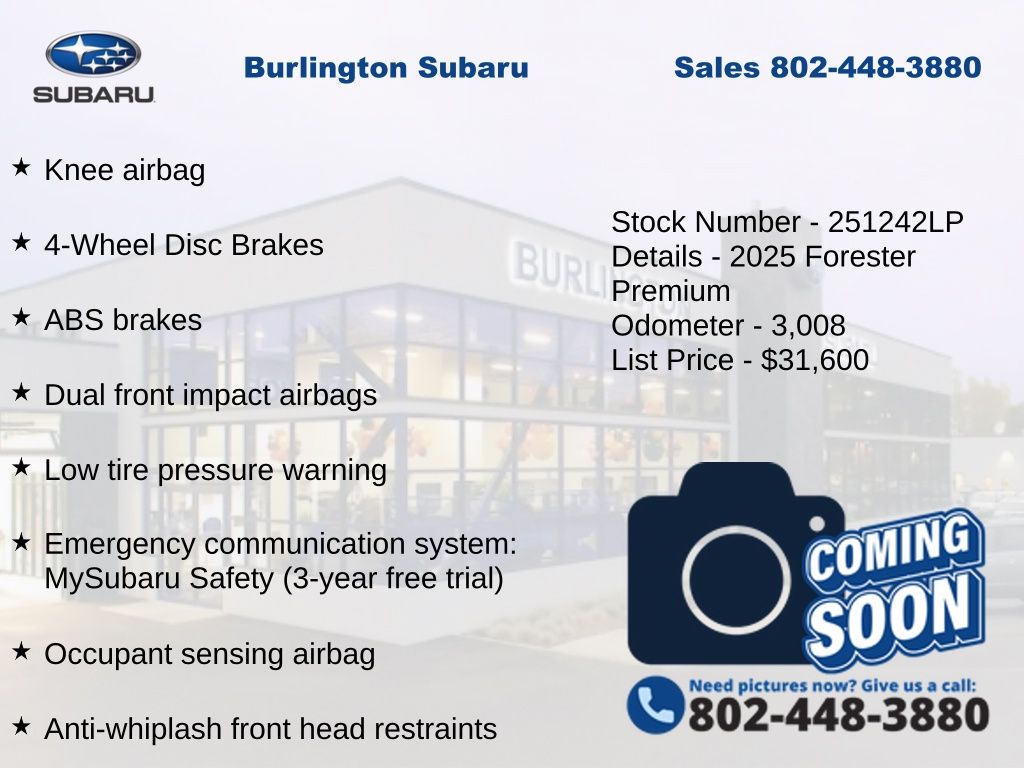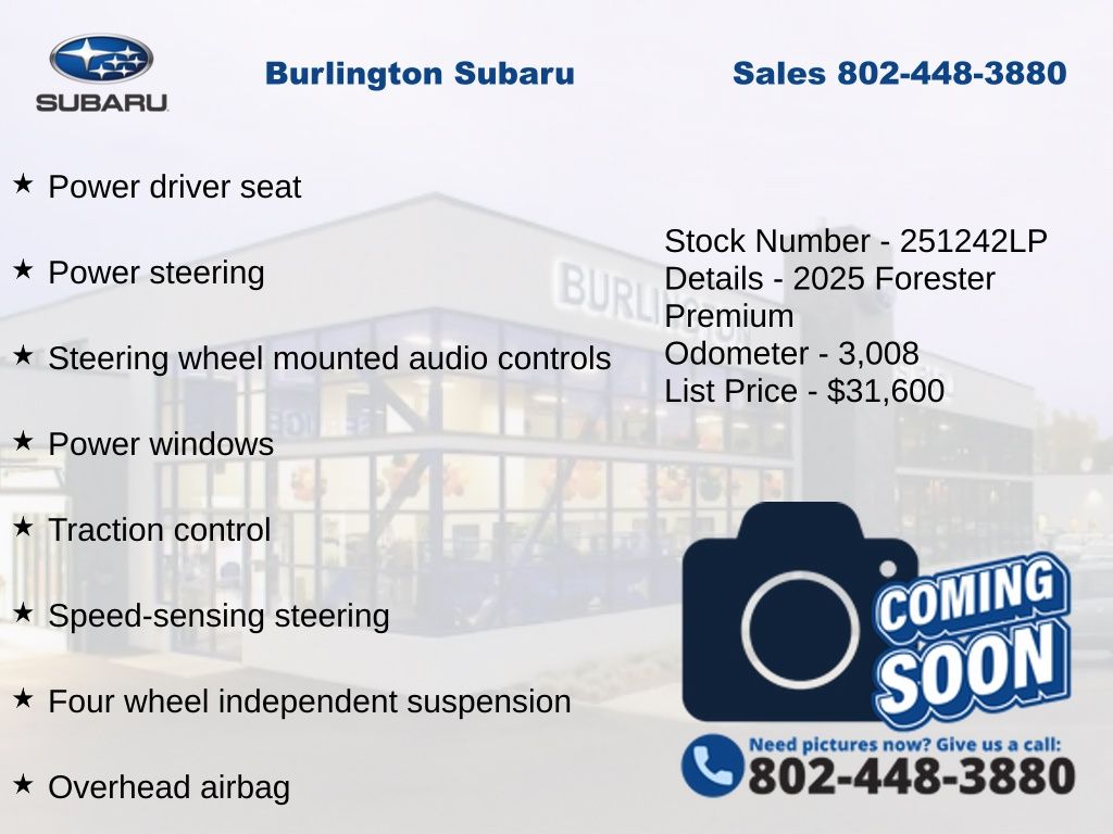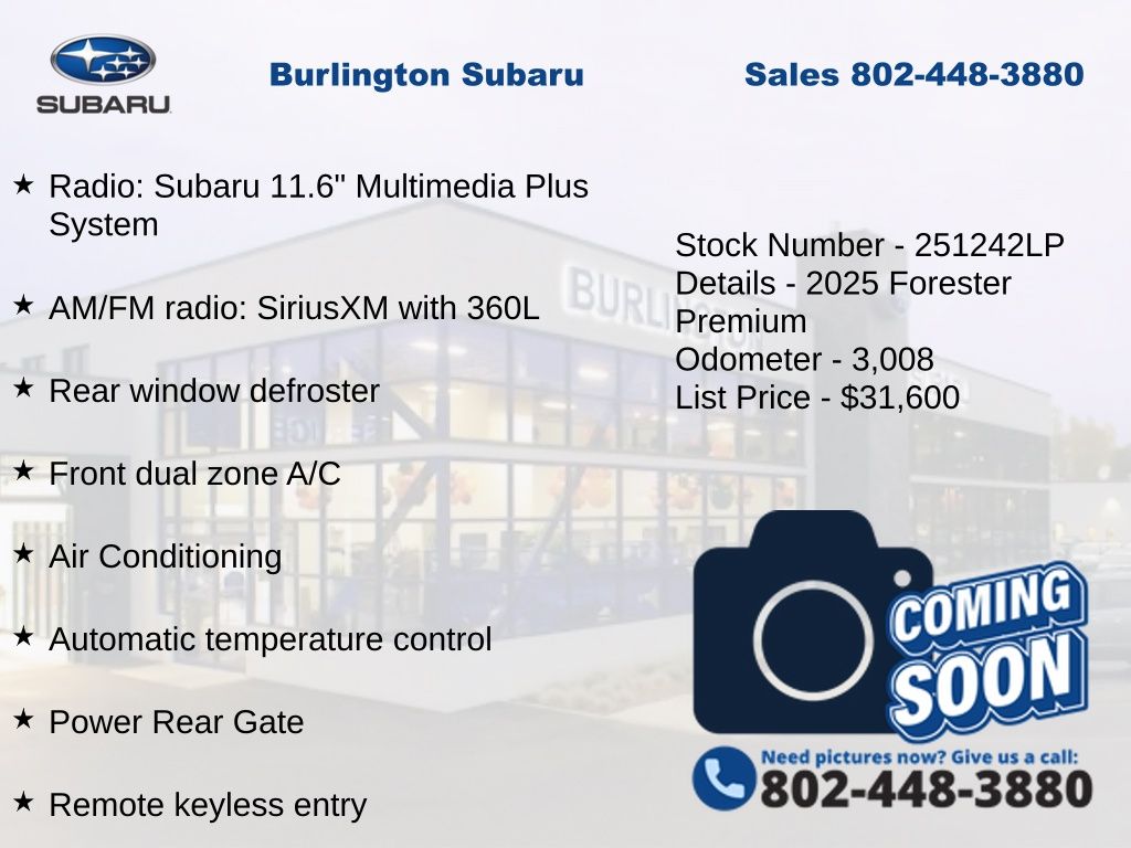 Clean CARFAX. Subaru Forester Premium 2025 4-Wheel Disc Brakes, ABS brakes, Air Conditioning, Alloy wheels, AM/FM radio: SiriusXM with 360L, Anti-whiplash front head restraints, Auto High-beam Headlights, Automatic Emergency Steering, Automatic temperature control, Blind-Spot Detection (BSD)/RCTA System, Brake assist, Driver vanity mirror, Dual front impact airbags, Dual front side impact airbags, Electronic Stability Control, Emergency communication system: MySubaru Safety (3-year free trial), Exterior Parking Camera Rear, Four wheel independent suspension, Front dual zone A/C, Front fog lights, Front reading lights, Fully automatic headlights, Heated door mirrors, Heated Front Bucket Seats, Illuminated entry, Knee airbag, Leather steering wheel, Low tire pressure warning, Occupant sensing airbag, Outside temperature display, Overhead airbag, Panic alarm, Passenger vanity mirror, Power door mirrors, Power driver seat, Power moonroof: Panoramic, Power Rear Gate, Power steering, Power windows, Premium Textured Cloth Upholstery, Radio: Subaru 11.6" Multimedia Plus System, Rear window defroster, Rear window wiper, Remote keyless entry, Speed control, Speed-sensing steering, Split folding rear seat, Steering wheel mounted audio controls, Tachometer, Telescoping steering wheel, Tilt steering wheel, Traction control, Trip computer, Variably intermittent wipers. Odometer is 8857 miles below market average!