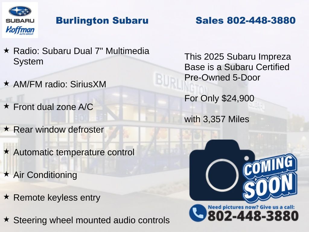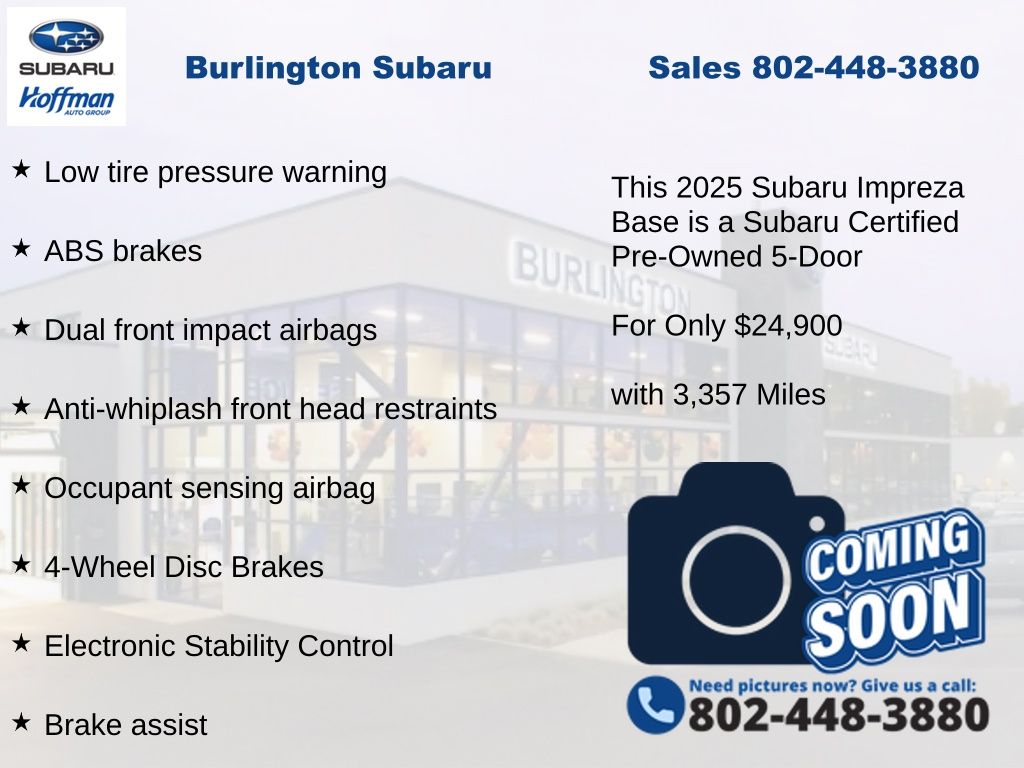 CARFAX One-Owner. Clean CARFAX. Subaru Impreza 2025 Certified. 4-Wheel Disc Brakes, ABS brakes, Air Conditioning, Alloy Wheels, AM/FM radio: SiriusXM, Anti-whiplash front head restraints, Auto High-beam Headlights, Automatic temperature control, Brake assist, Driver vanity mirror, Dual front impact airbags, Dual front side impact airbags, Electronic Stability Control, Exterior Parking Camera Rear, Four wheel independent suspension, Front Bucket Seats, Front dual zone A/C, Front reading lights, Fully automatic headlights, Illuminated entry, Knee airbag, Low tire pressure warning, Occupant sensing airbag, Outside temperature display, Overhead airbag, Panic alarm, Passenger vanity mirror, Power door mirrors, Power steering, Power windows, Radio: Subaru Dual 7" Multimedia System, Rear window defroster, Rear window wiper, Remote keyless entry, Speed control, Speed-sensing steering, Split folding rear seat, Steering wheel mounted audio controls, Tachometer, Telescoping steering wheel, Tilt steering wheel, Traction control, Trip computer, Variably intermittent wipers, Wheels: 16" x 6.0" 1/2J Silver Aluminum Alloy.
