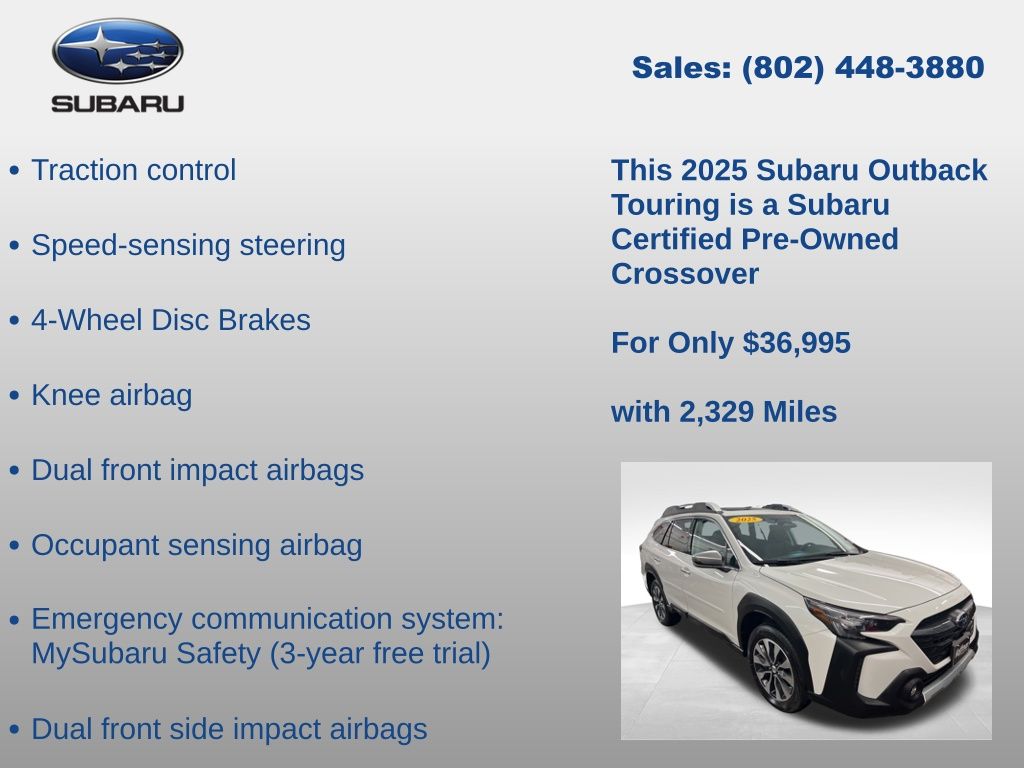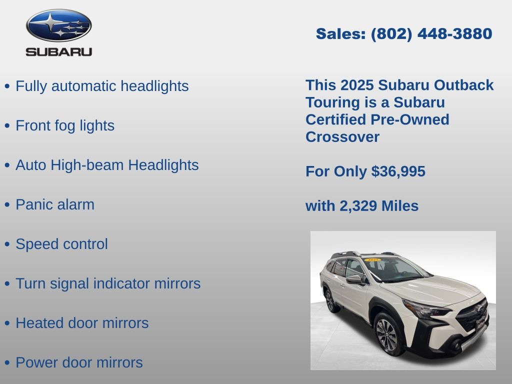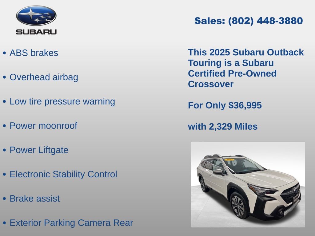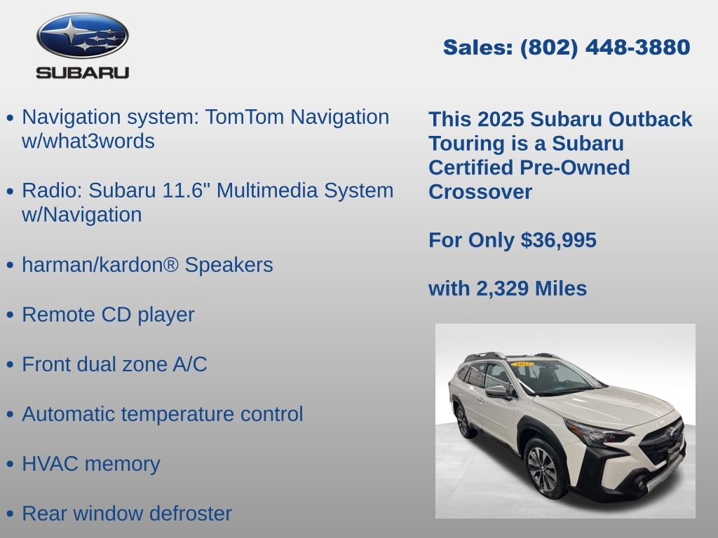 Clean CARFAX. Subaru Outback Touring 2025 Certified. 4-Wheel Disc Brakes, ABS brakes, Air Conditioning, Alloy wheels, Apple CarPlay & Android Auto, Auto High-beam Headlights, Auto-dimming Rear-View mirror, Automatic temperature control, Brake assist, Compass, Driver vanity mirror, Dual front impact airbags, Dual front side impact airbags, Electronic Stability Control, Emergency communication system: MySubaru Safety (3-year free trial), Exterior Parking Camera Rear, Four wheel independent suspension, Front dual zone A/C, Front fog lights, Front reading lights, Fully automatic headlights, Garage door transmitter: HomeLink, harman/kardon® Speakers, Heated & Ventilated Front Bucket Seats, Heated door mirrors, Heated steering wheel, HVAC memory, Illuminated entry, Knee airbag, Leather Shift Knob, Leather steering wheel, Low tire pressure warning, Memory seat, Navigation system: TomTom Navigation w/what3words, Occupant sensing airbag, Outside temperature display, Overhead airbag, Panic alarm, Passenger vanity mirror, Perforated Nappa Leather-Trimmed Upholstery, Power door mirrors, Power driver seat, Power Liftgate, Power moonroof, Power passenger seat, Power steering, Power windows, Radio: Subaru 11.6" Multimedia System w/Navigation, Rear window defroster, Rear window wiper, Remote CD player, Remote keyless entry, Speed control, Speed-sensing steering, Split folding rear seat, Steering wheel mounted audio controls, Tachometer, Telescoping steering wheel, Tilt steering wheel, Traction control, Trip computer, Turn signal indicator mirrors, Variably intermittent wipers, Ventilated front seats. Odometer is 6312 miles below market average!