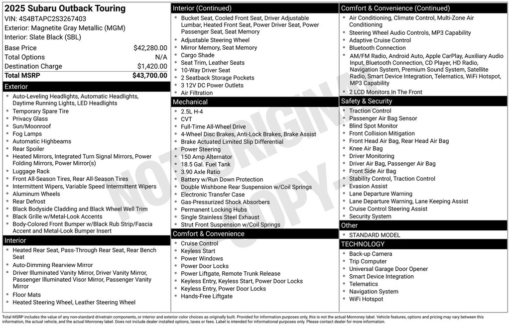 This is my second Outback Touring. I thought that the new technology and new body platform would be great, but I'm not so sure. My previous Outback had absolutely no rattles or squeaks, but this one does--in several places around the dash and the passenger side door, especially. Of course, the dealer couldn't hear any noises. There's also an occasional hesitation when driving. It's almost like the torque converter is disengaging momentarily. The dealer told me that the transmission is still "learning" my driving habits. There was nothing like that in the 2019 Outback. The new screen size is nice, but as I've read, and agree, there are too many menus to go through to get to what one wants. The heated seat controls are just one example. Invariably I will get a warning to pay attention when I am trying to find something on the screen. So far gas mileage is great. On a smooth flat road the ride is very comfortable and on the freeway I like the lane centering feature that my other one didn't have.… - 5.0
