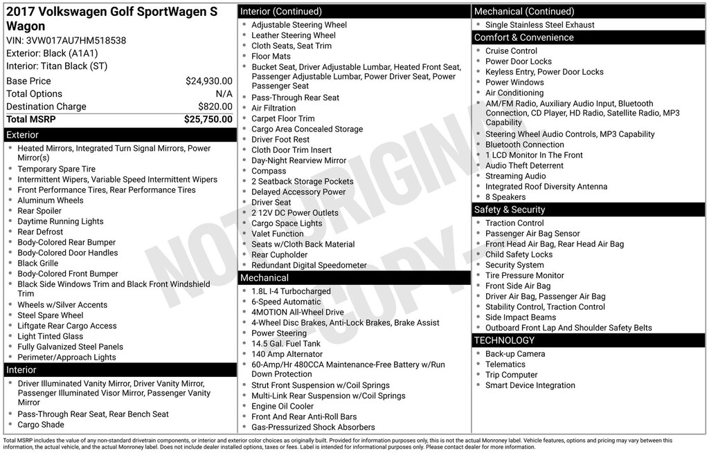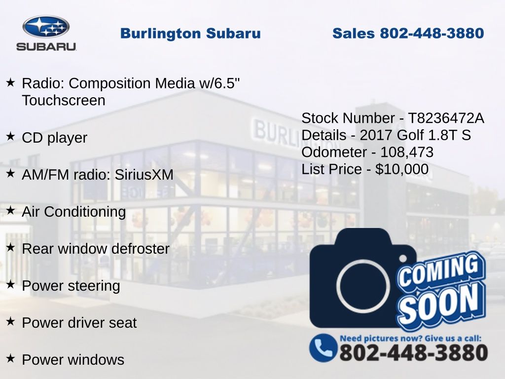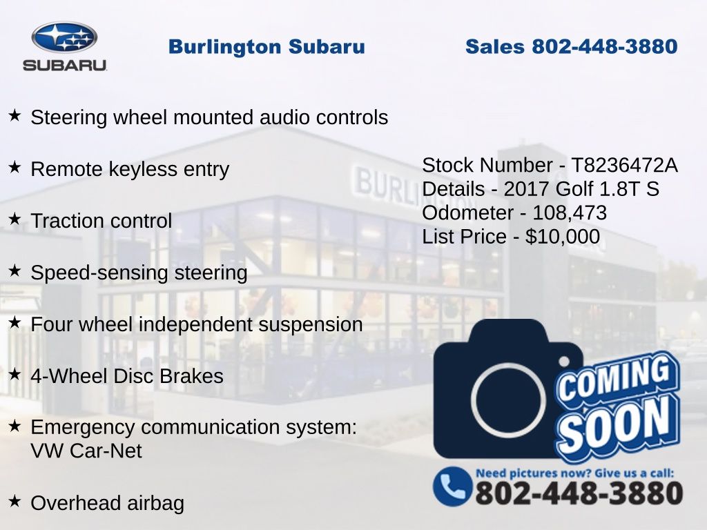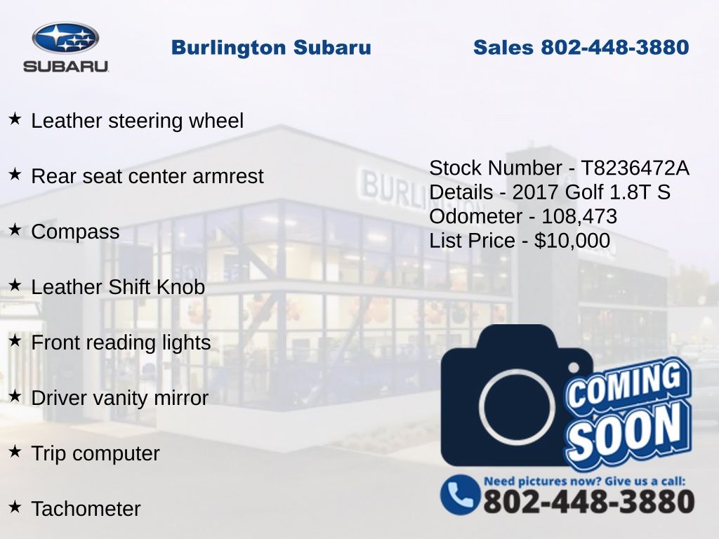 Clean CARFAX. Volkswagen Golf SportWagen S 2017 4-Wheel Disc Brakes, ABS brakes, Air Conditioning, Alloy wheels, AM/FM radio: SiriusXM, Anti-whiplash front head restraints, Brake assist, CD player, Compass, Driver vanity mirror, Dual front impact airbags, Dual front side impact airbags, Electronic Stability Control, Emergency communication system: VW Car-Net, Exterior Parking Camera Rear, Four wheel independent suspension, Front Bucket Seats, Front reading lights, Heated Comfort Front Seats, Heated door mirrors, Heated front seats, Illuminated entry, Leather Shift Knob, Leather steering wheel, Low tire pressure warning, Occupant sensing airbag, Outside temperature display, Overhead airbag, Panic alarm, Passenger vanity mirror, Power door mirrors, Power driver seat, Power passenger seat, Power steering, Power windows, Radio: Composition Media w/6.5" Touchscreen, Rear reading lights, Rear seat center armrest, Rear window defroster, Rear window wiper, Remote keyless entry, Speed control, Speed-sensing steering, Split folding rear seat, Steering wheel mounted audio controls, Tachometer, Telescoping steering wheel, Tilt steering wheel, Traction control, Trip computer, Turn signal indicator mirrors, Variably intermittent wipers.